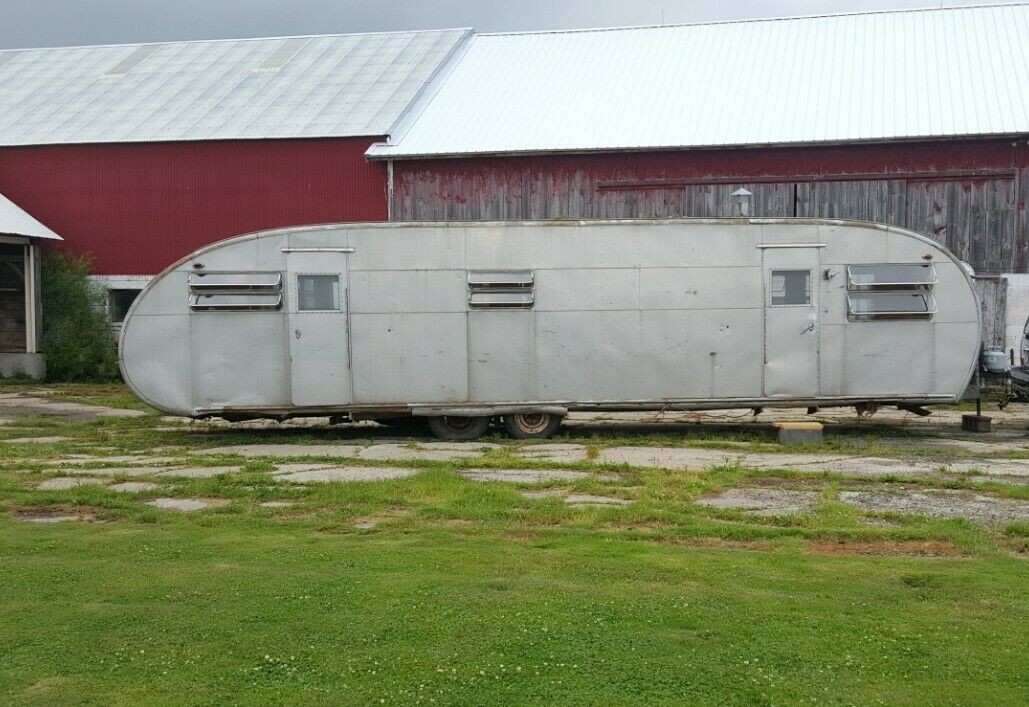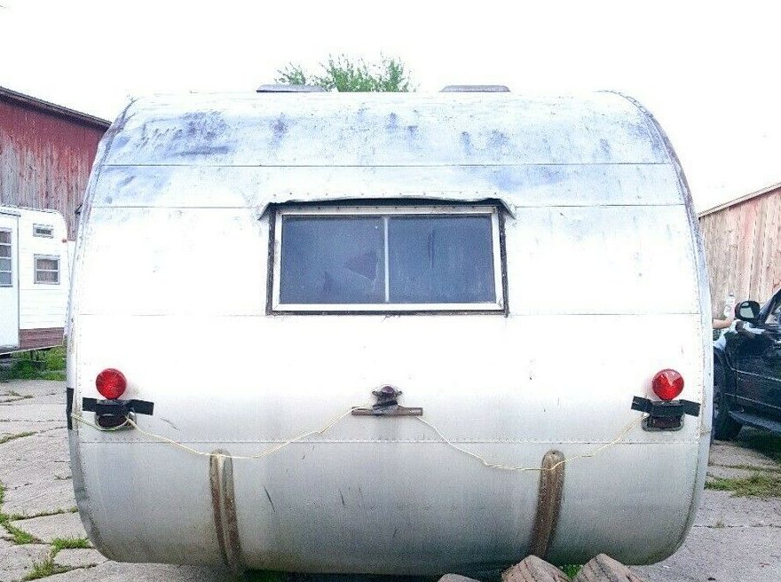 This mammoth camper trailer is a 1952 Royal Spartanette, and according to the seller, it sat languishing in a camp ground until she was able to rescue it. These vintage aluminum trailers are serious labors of love, not only for the extensive renovations they typically need inside, but also because of the logistics involved in storing and transporting them. Still, they are hard to find in restorable condition – meaning, not so far gone that it’s a completely hopeless affair. This one appears to have good bones and is worth of rescuing, so check it out here on eBay where it’s listed with an opening bid of $5,500 and no action yet.