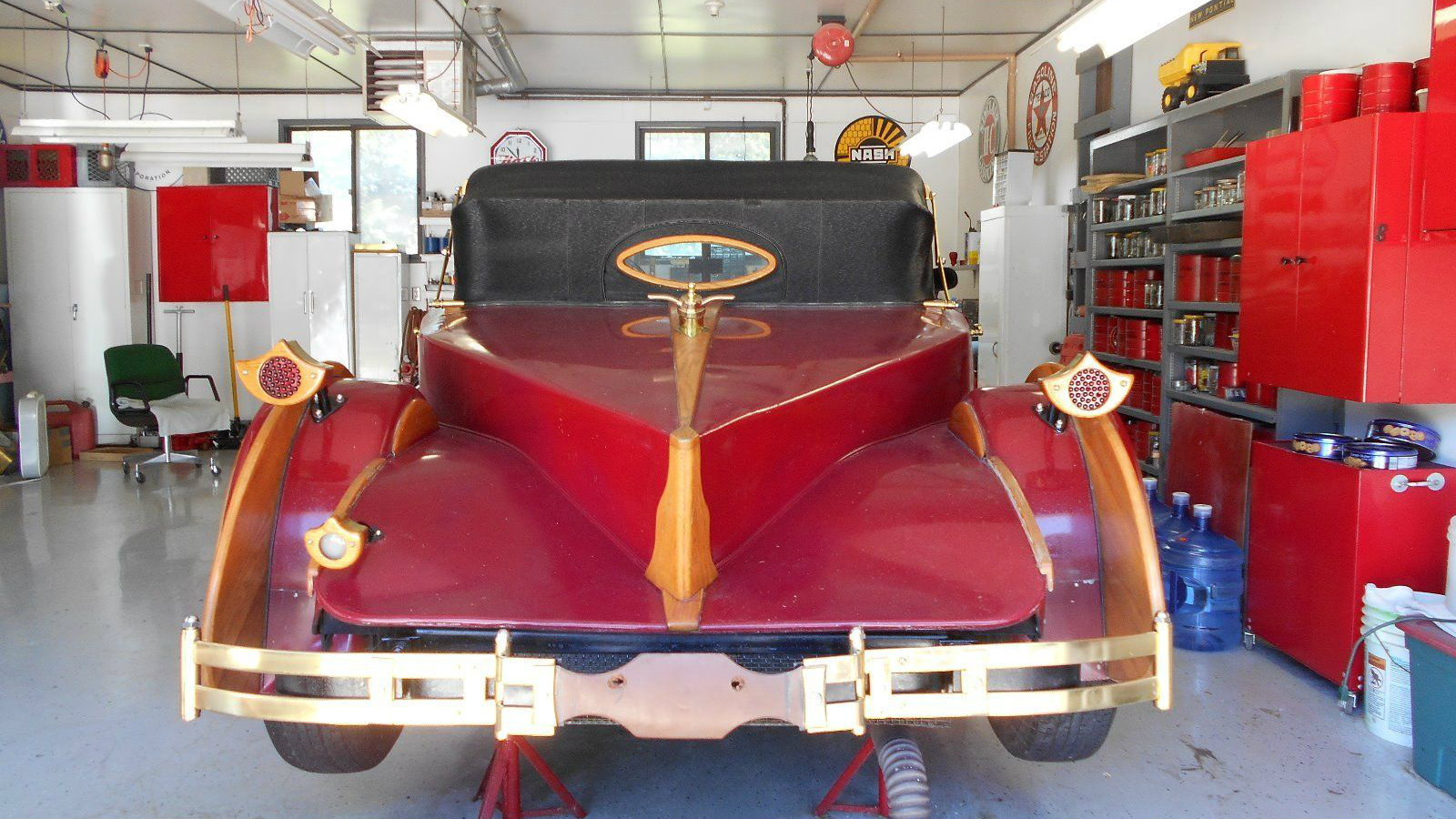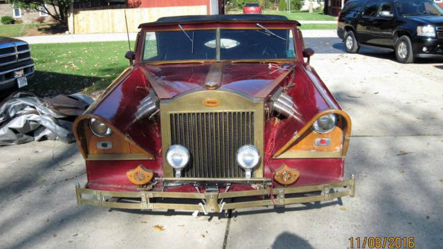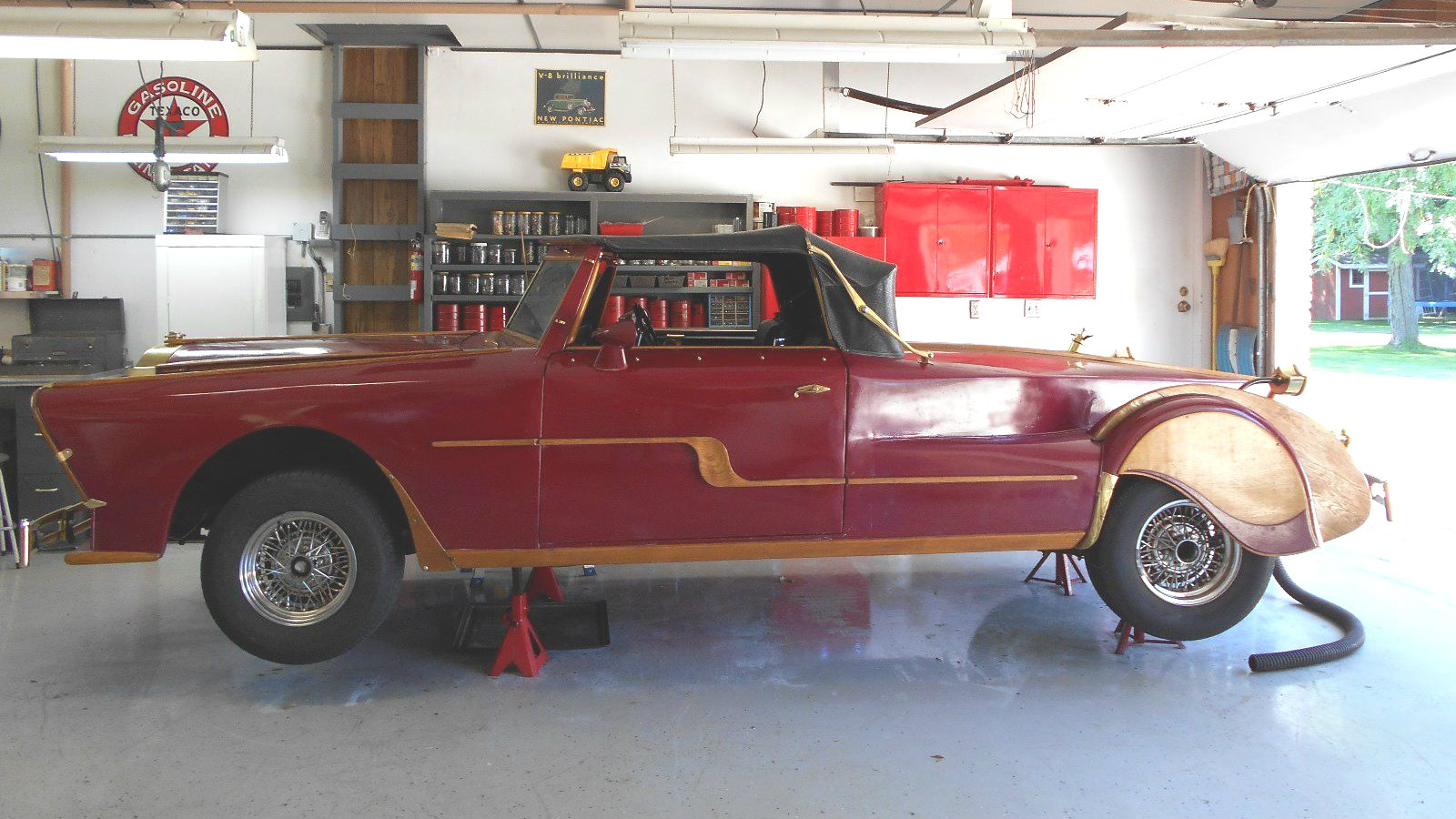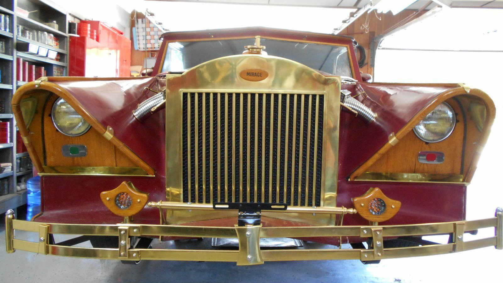 Let’s compare some pictures. The picture above shows the car in the auction, presumably in it’s current condition. Nicely polished brass! All the bodywork is metal, by the way, so you know that took a tremendous amount of time and effort to get right. Just imagine what it took to get the curved wood correct for those front fender lips! I realize the Mirage might not be your style — it’s not mine — but you have to admire the passion and work that went into its creation.