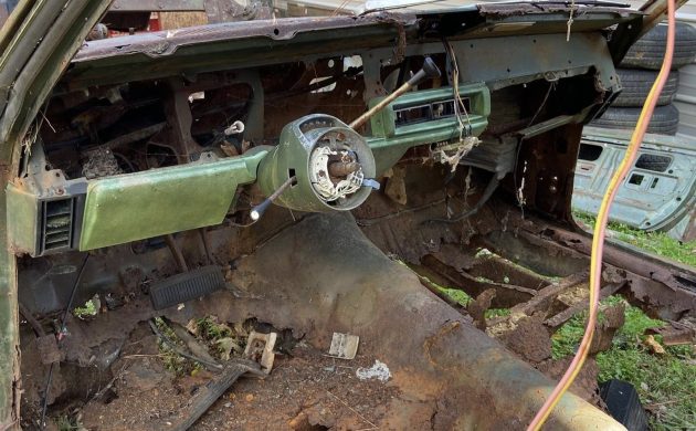 A prior owner cut off the rear part of the car to use as “wall art.” The cowl tag also reveals that the paint was originally EF8 green with a black vinyl top and green interior. Not much of that is left to eyeball, and the floors are completely rusted through. Except for the windshield, much of the glass has been kept, along with not one but two trunk lids. There is no title, but if you’re considering this purchase, it’s probably the VIN and cowl tags you want. And bring lots of ratchet strips because keeping this thing from falling off a flatbed won’t be easy.