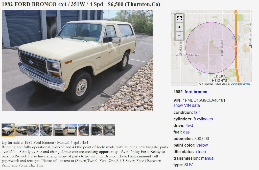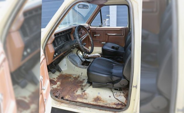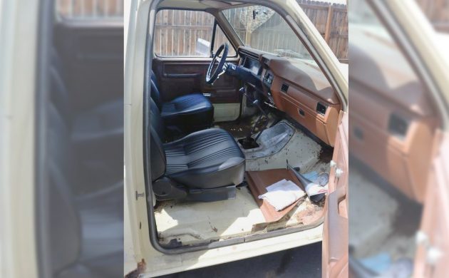 And there it is, in all its dusty glory. This should be a Windsor 351-cu.in. OHV V8, as the 351M was replaced by the Windsor for the 1982 model year. This one would have been factory-rated at 136 horsepower (although the VIN says 150?) and 262 lb-ft of torque. It’s backed by a 2-speed transfer case and a New Process 435 4-speed manual, sending power to all four wheels as needed. They say it’s running and fully operational, so that’s good. It isn’t the most glowing report on the drivetrain, so I’d plan on some tinkering here, too. Is this Bronco worth restoring, or would you put the trim back on and drive it as is? Or, don’t even bother with the trim, just drive it!
