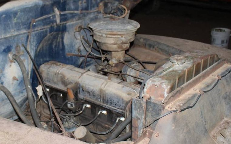 The engine, a 90 HP, 216 CI, in-line six, as previously mentioned, has been dormant for a half-century. The freeze damage is not specified so it could be major block damage, or perhaps a dislodged freeze-plug. What is visible looks complete but a thorough investigation would need to be conducted. The transmission is listed as manual so it’s probably a four-speed unit with a “granny” gear.