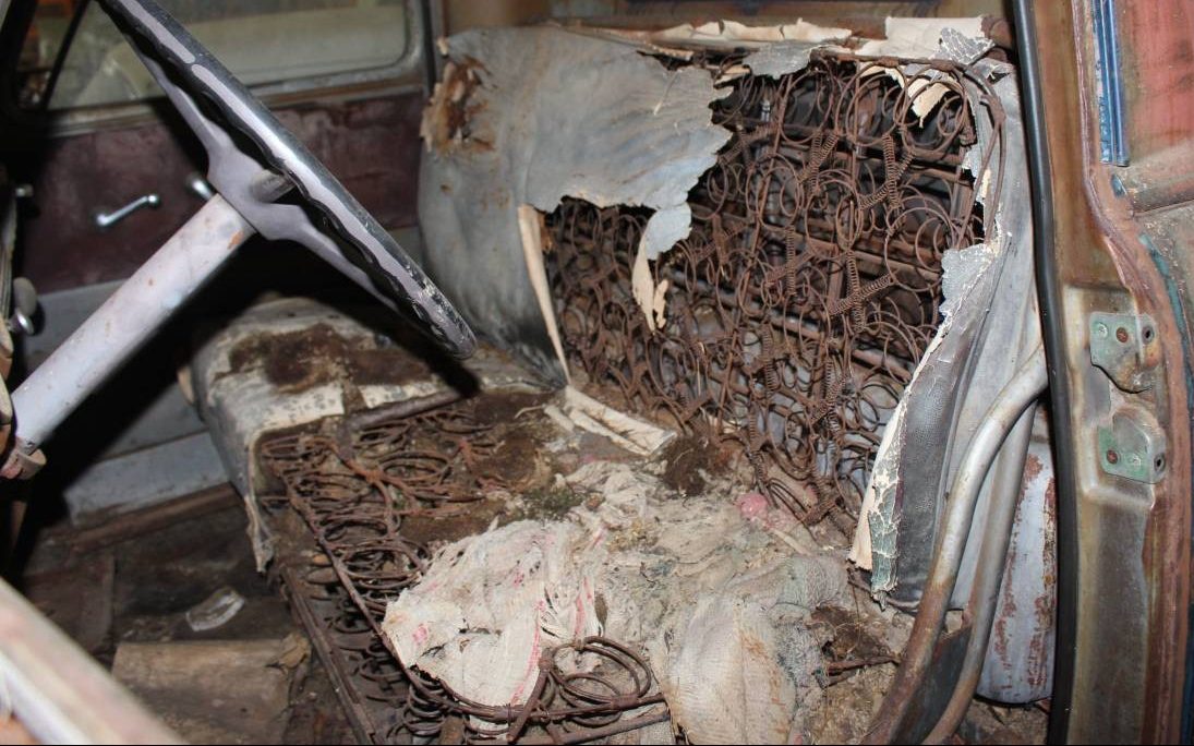 The interior looks like a weasel riot or something happened, the seat is mostly frame and springs. The rubber floor mat has disintegrated but it reveals what looks like solid floors though I’m not certain what the purpose of the odd-shaped hole is in the driver’s footwell. The upholstery panels are trashed and show signs of water incursion and there is a light coating of rust on pretty much every metal surface. The seller mentions that the dash is “uncut” with the radio plate still in place – I wonder how many of these early Advanced Design trucks had factory-installed radios? The interior is a good news-bad news story – the good news is that there isn’t much to it, as in not a lot of real estate to improve; the bad news, of course, is its current condition.