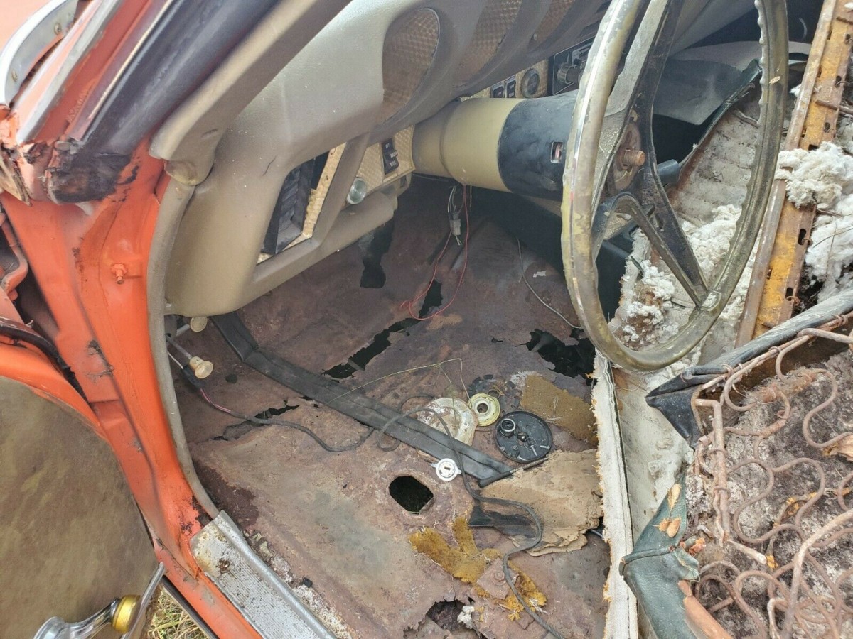 This 1969 GTO is said to have been stored in a barn since 1982. It looks to be wearing a faded version of Carousel Red (aka orange) paint, which was pretty common on the Judge during its brief run. While the sheet metal doesn’t look bad, buyers should be wary of the underpinnings of the car. The floorboards have achieved see-through status and it wouldn’t be a surprise to find it elsewhere, such as the trunk floor. There’s a rope tied to the back that looks to be keeping the bumper hooked to the spoiler. There’s not much good to be said for the interior as it may have been vandalized by critters while in the barn. Most everything there is torn or worn through.