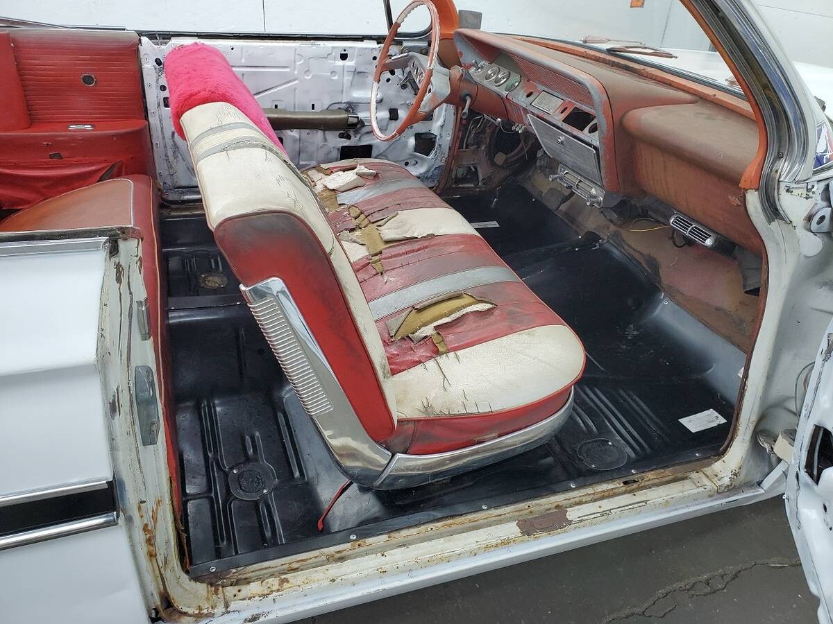Its seat covers don’t look like what I’ve seen in other ’61 Impalas, appears to be out of like 3 different cars… Seat patterns somehow make me think a Pontiac design, anyone recognize them? Maybe sourced from a Cheviac? Or were some Canuck Chevs delivered with any unique to Canadian market upholstery…?