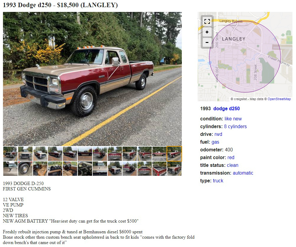 The last year of the “classic” Dodge pickups, before they went to the big-rig-looking redesign for the 1994 model year, this beautiful 1993 Dodge Ram 250 Club Cab diesel is posted here on craigslist in Langley, British Columbia, Canada. The seller is asking $18,500, but we’re not sure if that’s Canadian or U.S. funds. $18,500 Canadian is $13,100 U.S., just for the record. Here is the original listing, and thanks to Curvette for the tip!