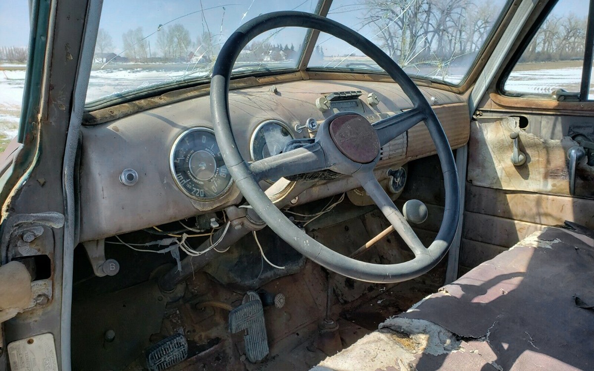 The interior looks just about exactly what you thought it would look like and probably what it should look like after 66 years of use. The seller calls this a barn find and an incredibly solid truck. It looks like it, there would be so much more rust on this pickup if it would have been in an area that used a lot of road salt.