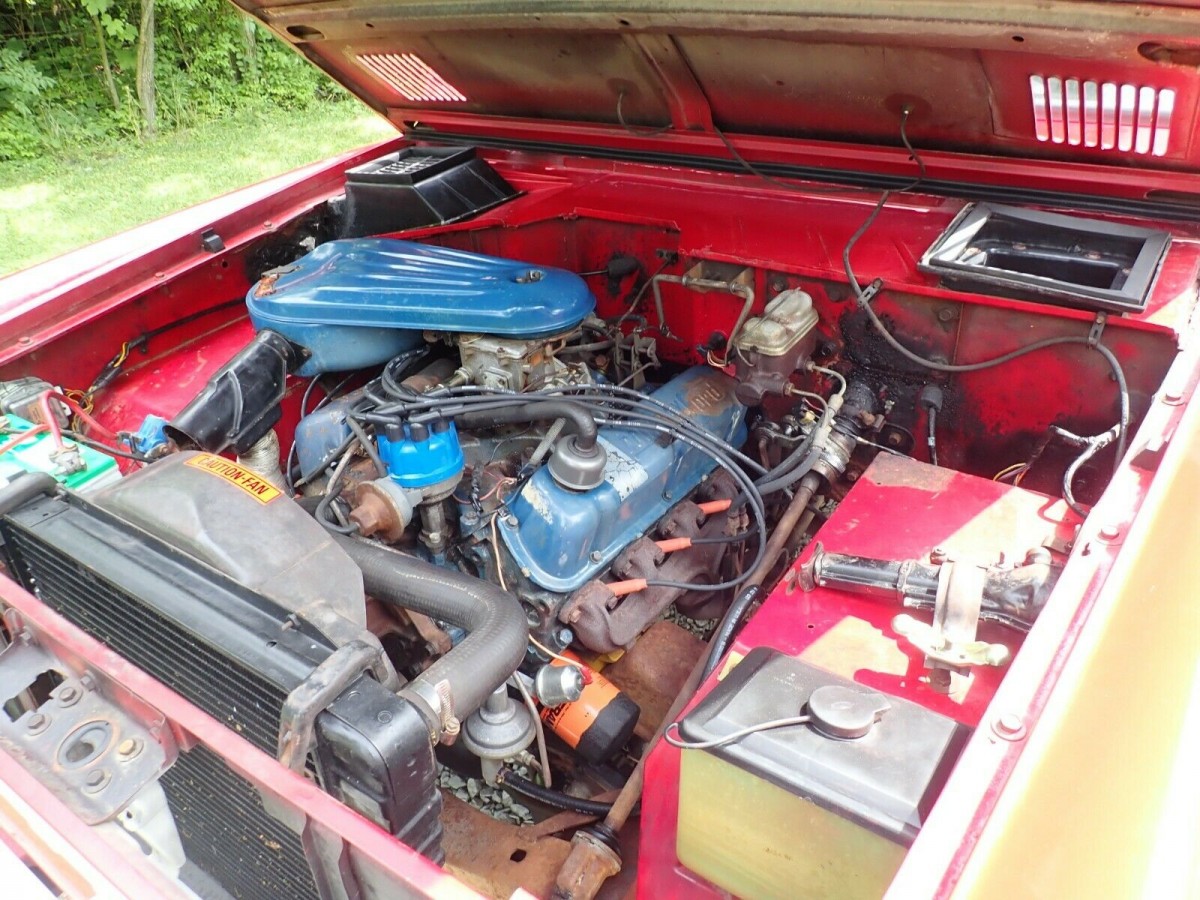 The Bronco was restored about 20 years ago and has the desirable 302 cubic inch V8 engine with a 2 barrel carburetor. Supposedly, less than 2,300 were delivered in this bright candy apple red paint. There are some bubbles in the paint and the floor boards are barely holding on. The engine is shifted with a three speed column mounted manual transmission. Obviously, the 4WD shift selector is on the floor.