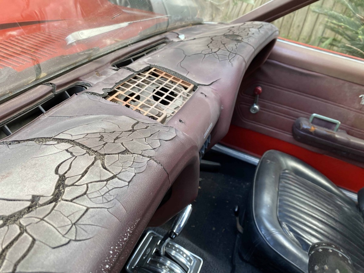 Inside the car resides a terribly cracked and warped dash pad, but a brand-new wraparound version is being provided by the seller. There is a ripped seam in one of the seats and the carpeting may need replacing. New weather stripping will need to be added to the shopping list, as well. The 302 with an automatic does run, although we’re not told how well, and a new battery will likely need sourcing. An air conditioning compressor is present but there is no fan belt for it, so perhaps it no longer works.