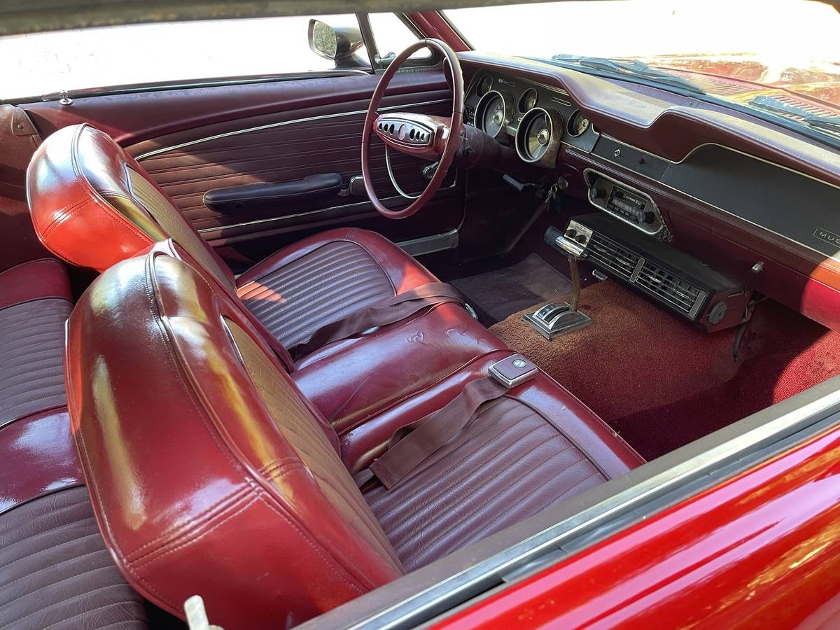 The Candy Apple red paint is nice and shiny with no dents or rust present. It’s paired with a matching red interior with a center armrest and a black vinyl top. The carpeting is a bit faded and dyeing it or replacing it wouldn’t hurt. The white GT stripes accent the car nicely. Air conditioning is present, but we’re not certain that it wasn’t added later. The unit under the dash doesn’t look like the ones used by Ford with Mustangs from 1965-68.