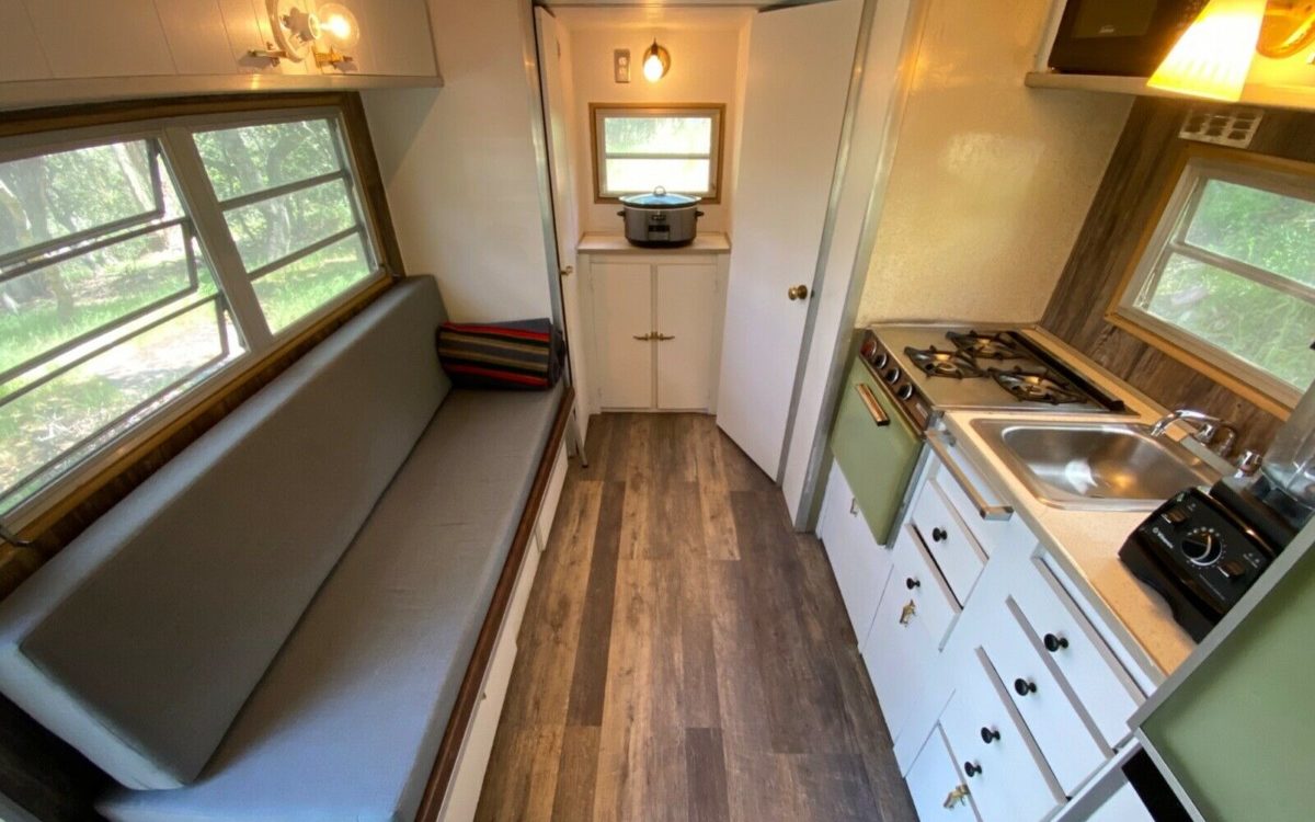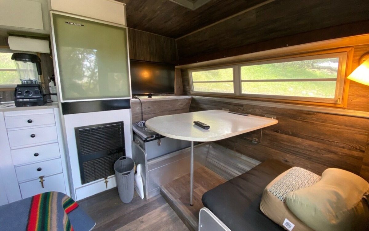 The interior has seen extensive remodeling and the seller considers it to be 99% finished. There’s not a dedicated sleeping area, but the couch folds down to a bed.