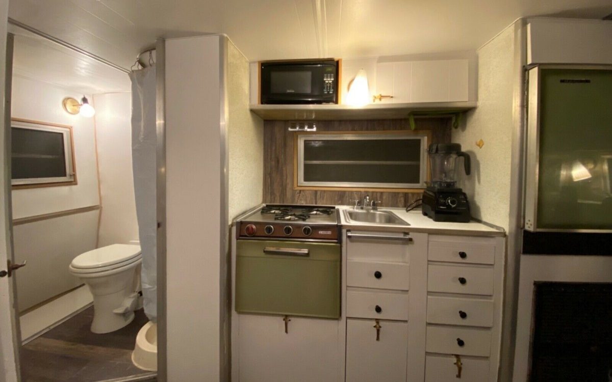 Above you’ll see a full kitchen, of course including an avocado green gas range and refrigerator. The stovetop works, but no attempt has been made to operate the oven. The current owner has ditched the use of the fridge in favor of a solar powered dual-zone low draw refrigerator, which is included. On the back end of the trailer is a fully functioning full bath, which has also been updated.