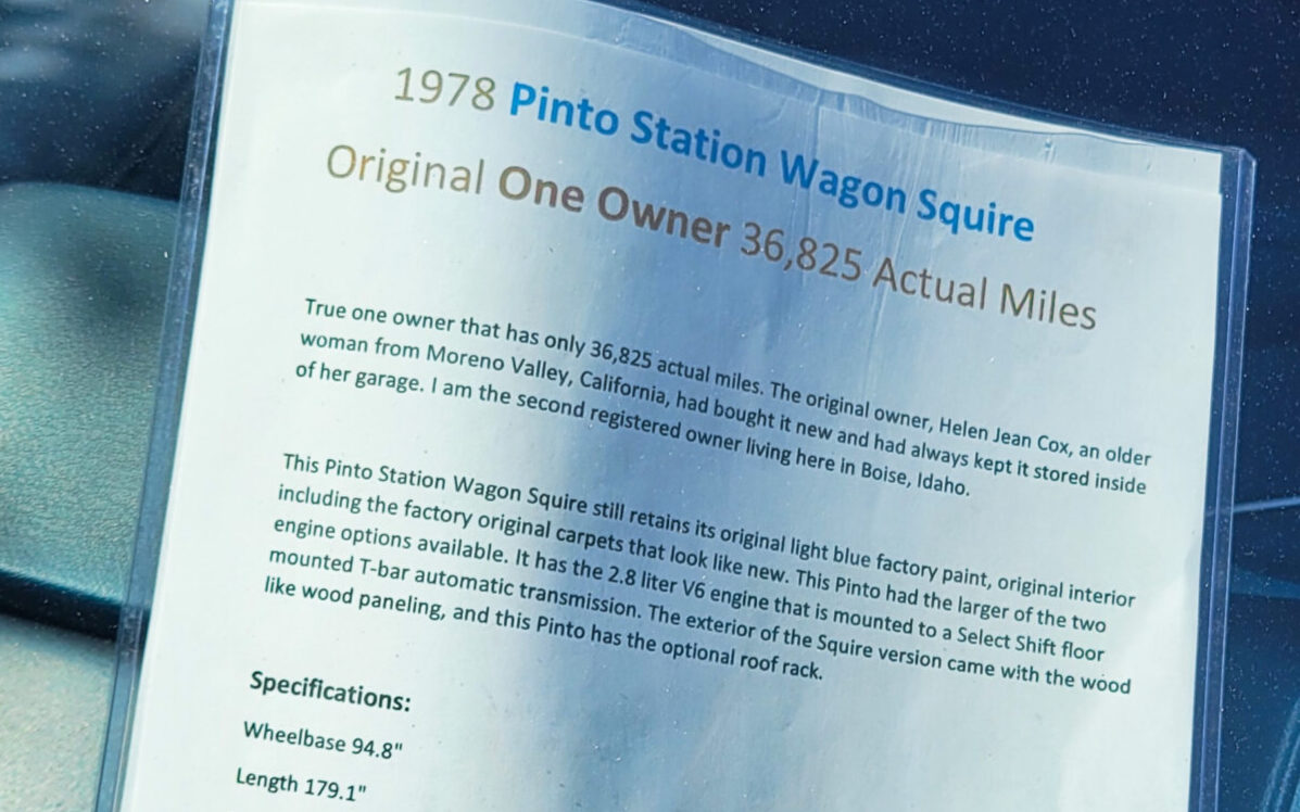 “Of the 100 or so cars in attendance, it was a 1978 Ford Pinto Station Wagon Squire in all original survivor condition that really stood out in the crowd!”