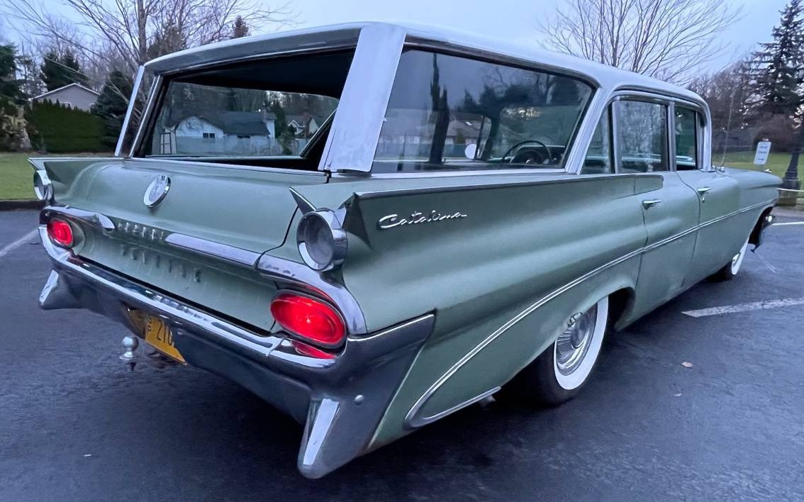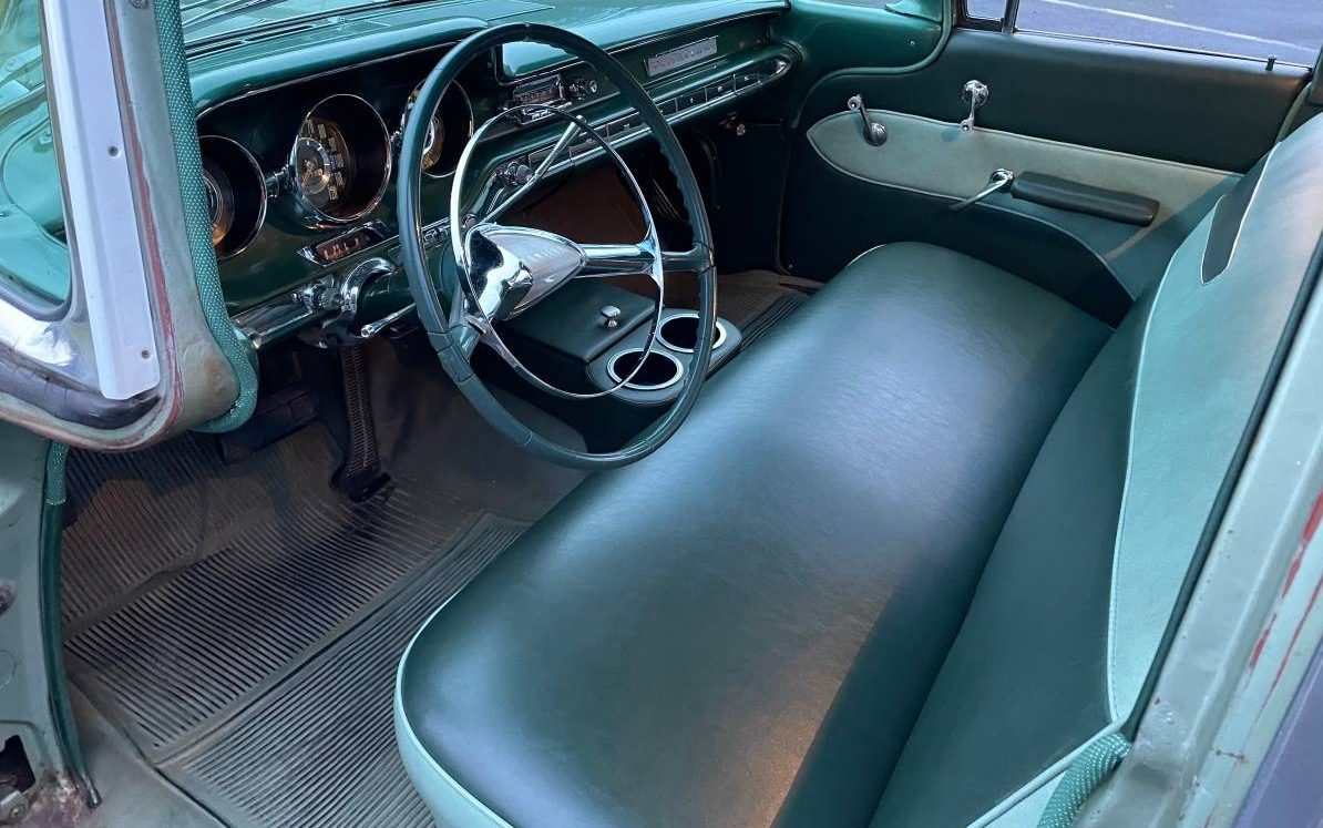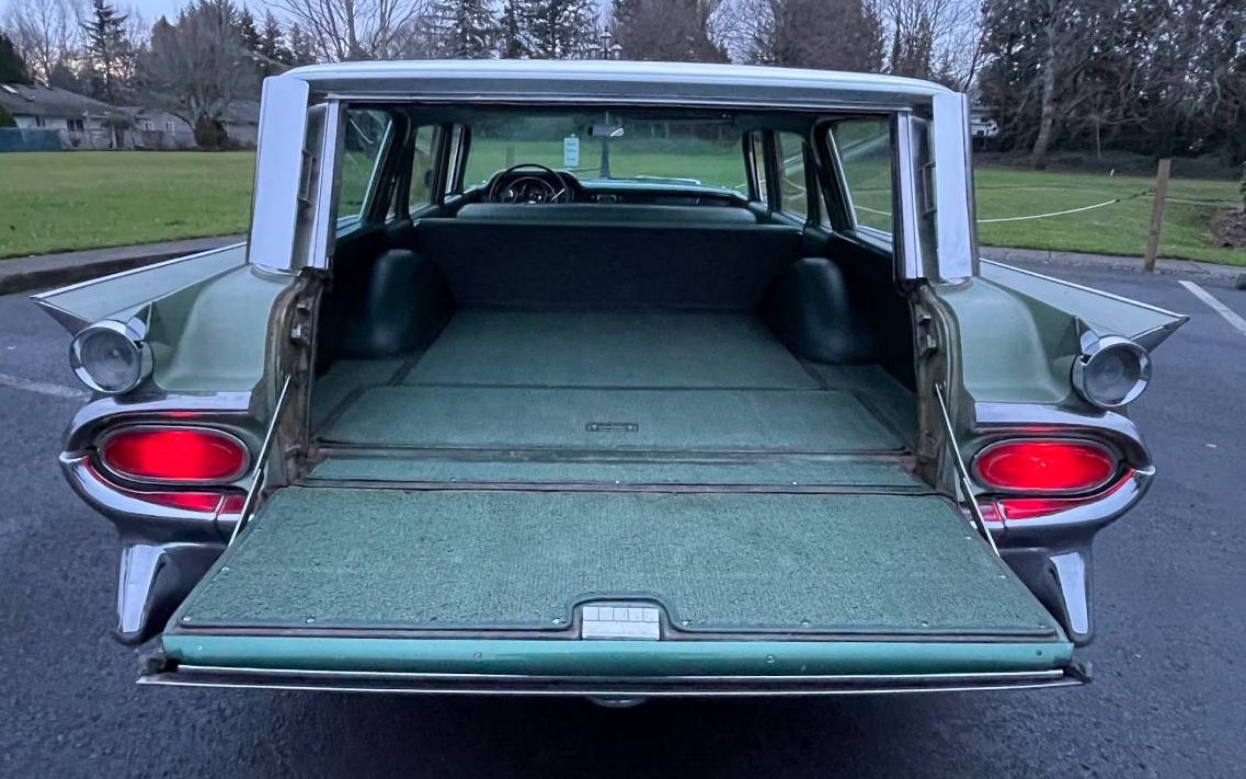 The Safari came in both Bonneville and Catalina trim in ’59 and this example is the lower level Catalina but from its exterior presentation, it doesn’t look like lower-level anything. The chrome and that previously mentioned trim still look strong – it’s all intact and still has some shine. Unfortunately, the finish, at least on the hood and front clip, is starting to fail – no surprise if it’s original. The color, which looks like Berkshire Green, was a big hit on ’59 Pontiacs and I have seen many finished in that shade including on a high school friend’s ’59 four-door sedan from many years ago. Beyond the fade, and a few scratches, the body of this Safari is solid, there is no sign of rust which is a common affliction with GM cars (practically every manufacturer’s cars) of this era. Gotta love those curb-feelers, I don’t think I have encountered one of those in a very long time.