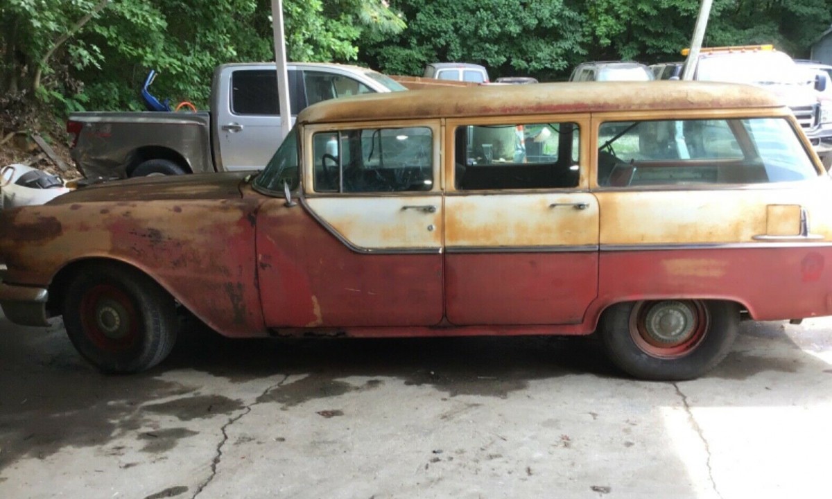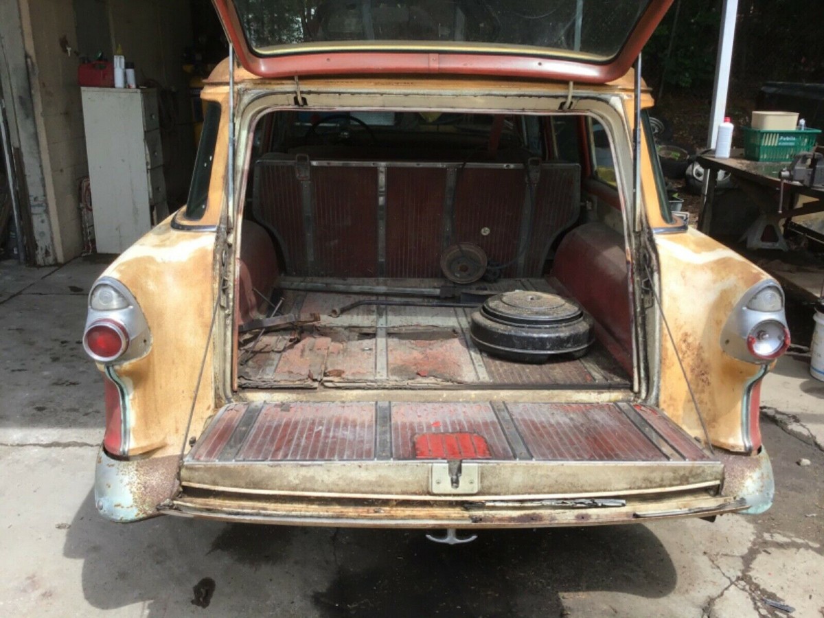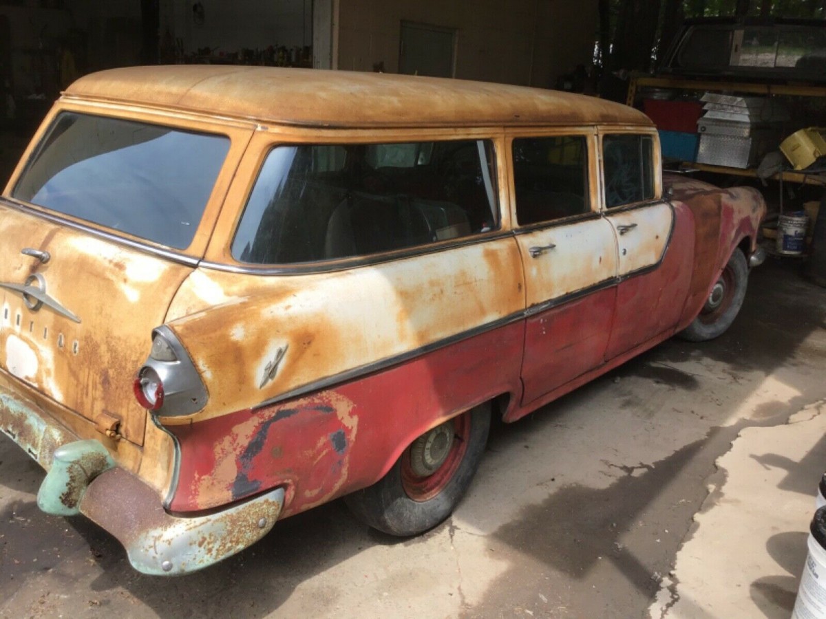 Around 40 years ago I found the ’55 Pontiac 2 door version of this wagon. It was yellow and white outside, same red and white inside as this one. I decided the door and rear seat side panels would look “custom” in a ’55 Chevy, so I bought them. The wagon was in kind of a swampy area of the yard with a car tight on one side and a tree on the other, couldn’t get the doors open enough to crawl in. Had to climb in through the tailgate. I think I sweated 10 pounds off getting the panels, but I got them. Never had the right car to put them in, think they’re still tucked away in the upstairs of my granary.