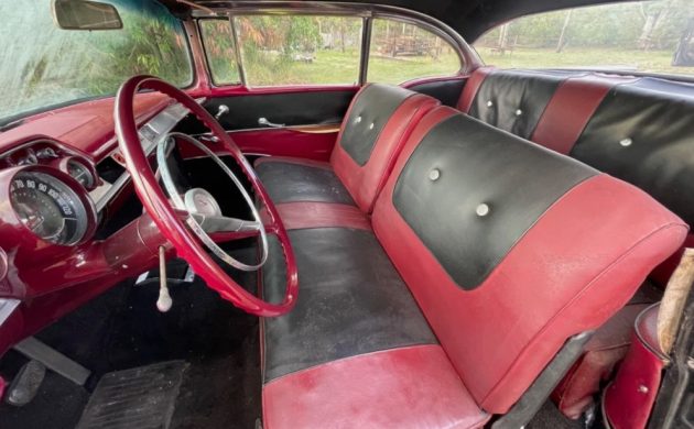 We’re told the black interior was redone about 15 years ago, but exposure has led to a bit of rust and a faded finish. The interior may or may not be original but some of the trim pieces are in a box. Extras include a set of fender skirts that could be OEM, some glass, weatherstripping, and an assortment of other stuff. This could be a nice ’57 Bel Air to restore – as long as numbers matching or period correct aren’t important to you.