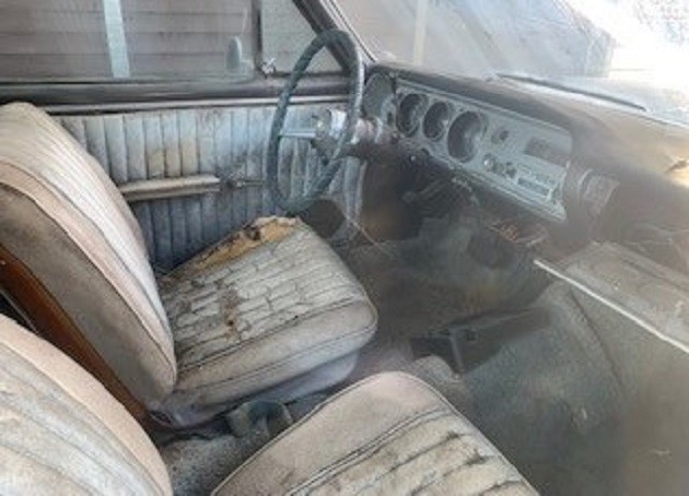 At 90,000 miles on the odometer, this El Camino has been dormant for 34 years. We’re told it was running at that time, but now if you try to crank it, all you’ll get is a spinning starter. The interior, complete with buckets seats, is going to need a total refresh and the body looks okay, including the bed, except for an assortment of surface rust. Perhaps Mother Nature has been kind, although there isn’t enough of the paint left to decide what color it once was. It did have factory A/C, but some of the hardware is missing.