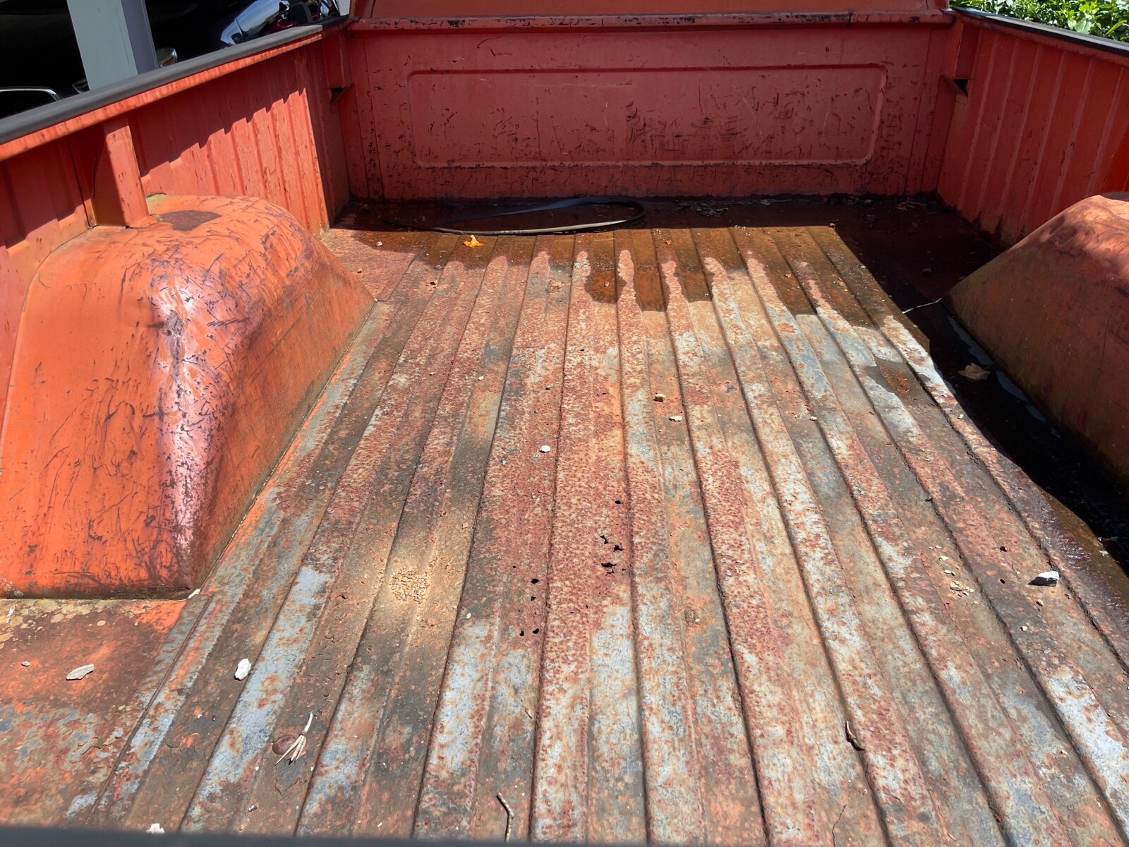 No specifics are mentioned regarding if this is 100% of the original orange paint remaining outside, but enough scuffing and fading are present along the body to indicate the truck may still be wearing at least partly a factory-applied finish, but for its age and the fact that this one’s no stranger to hauling, the exterior still looks pretty good overall. The bed is showing a fair amount of surface rust, but as far as the metal here actually being compromised I’m only seeing just a few small holes unless the area with water standing is hiding more.