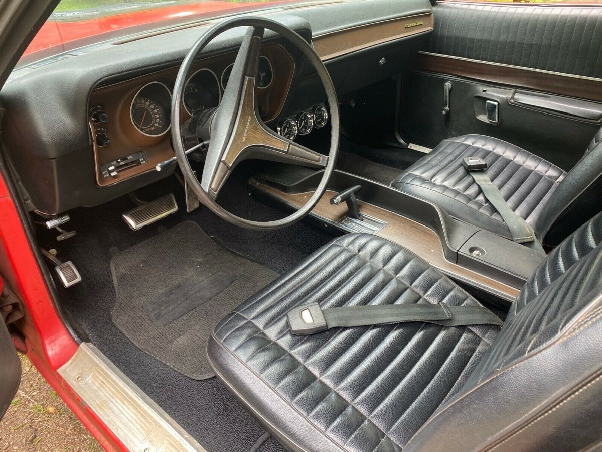 While the red paint looks good from a distance, rust has crept into several places, likely due to be exposed to the elements where it sat. The rear quarter panels have been affected as well as the right front fender, door bottoms, trunk drop rail, and around the rear window. To help facilitate repairing some of these areas, the seller has a complete back-half of another ’71 that he will throw in with the sale (bring a trailer). On the other hand, the interior looks pretty good and may need little or no work.