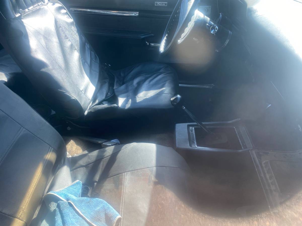 The car wears black paint that cleans up decently, but the seller says it needs some cosmetic work though the body is straight. Perhaps that attention is needed in the interior as the blurry photos show loose-fitting aftermarket seat covers everywhere with no indication as to the condition of what’s underneath. The carpeting appears to be faded from what we can tell. At 93,000 miles, this Nova has been treated with new American Racing wheels and tires along with redone front disc brakes (power-assisted). We’re told the power steering lines are bad, so it will be hard to steer until those are replaced.