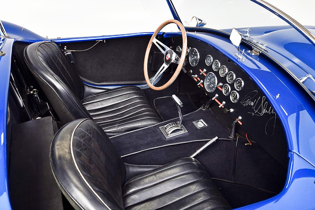 Seeing twin turbochargers isn’t all that unusual these days, but when was the last time you saw twin superchargers, especially on a car that was built in the 1960s? Each one is plumbed to its owner 4-barrel carburetor for a total of 8-barrels. The carbs are mounted to a cross-ram intake manifold and exhaust gas exits through the car’s original headers and side-pipes. And just to make sure we all know that this was a Shelby, Carroll signed one of the carburetor hats and while it’s looking a little thin, his signature is still there. Between the height of the carburetors and supercharger hats, the hood had to be modified with a massive scoop to make room and it just happens to create one of the best-looking Cobras ever built (at least in my opinion). According to Mr. Mullin, this car was beyond fast and didn’t just beat his Ferrari, but absolutely destroyed it. He claimed that the car accelerated harder from 140 than it did from a standstill and it was apparently good for 190 mph!
