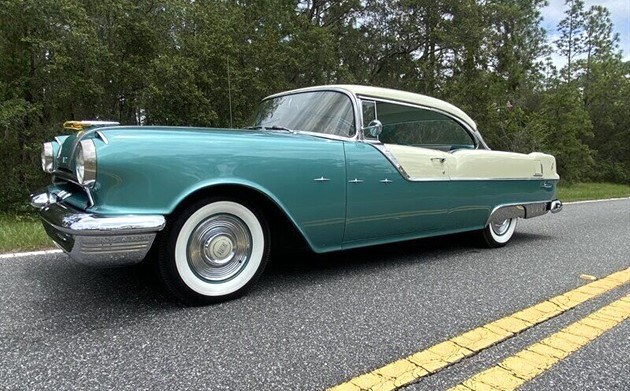 I love the 55 Pontiac Star Chief. I had one back 1964, mine had the bronze and cream colors, it also had leather upholstery. I would have kept it not for Uncle Sam. If I wasn’t in the middle of a major move, I’d be on this beauty.