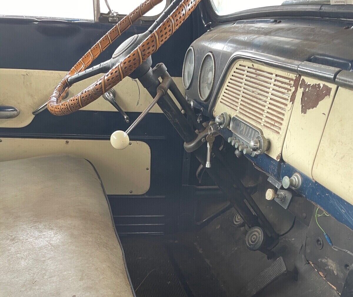 The blue-and-ivory interior looks good and has some character, but looks like it needs a cleaning. The bench seat has been reupholstered and doesn’t show any rips or tears, the rubber-mat floor appear to be solid, and the instrument panel continues the “patina” theme of the truck’s exterior, paint chips and all.