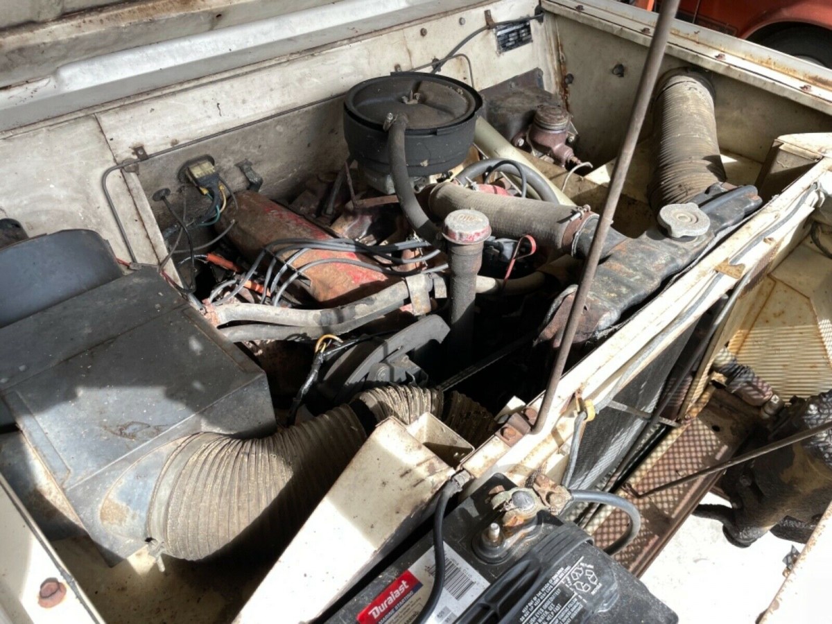 It’s a slant 4 – half of a 304 V8, in fact. Unfortunately it doesn’t have much torque. I’ve told the stories here in the past about the ’67 Scout Sportop that we owned from ’78-’81. Dad had to put the transfer case in low range (2 Lo) to climb our driveway because the engine didn’t have enough torque in spite of low axle gearing. We also had to put it in 2 Lo to get out onto the main road from our street because, again, not enough engine torque. We had numerous times when we were four wheeling that the whole family had to clamber out so Dad could attack a hill while we all prayed he would make it…. And since it was low geared, it wasn’t much for highway travel either.