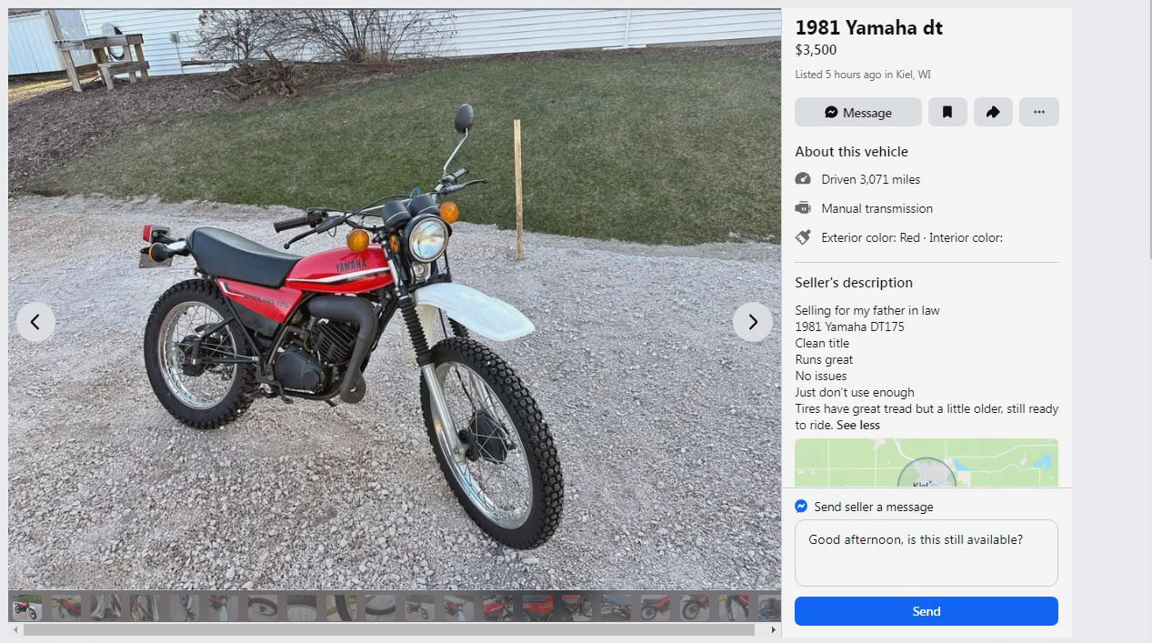 While similar to Yamaha’s DT125, the company’s DT175 was 50 better (in my best Nigel Tufnel from Spinal Tap voice). No, an easy way to tell them apart is that the DT175 was Chappy Red and the 125 was Sapphire Blue. This 1981 Yamaha DT175 can be found here on Facebook Marketplace in Kiel, Wisconsin, and they’re asking $3,500. Here is the original listing, and thanks to Lothar… of the Hill People for another great tip!