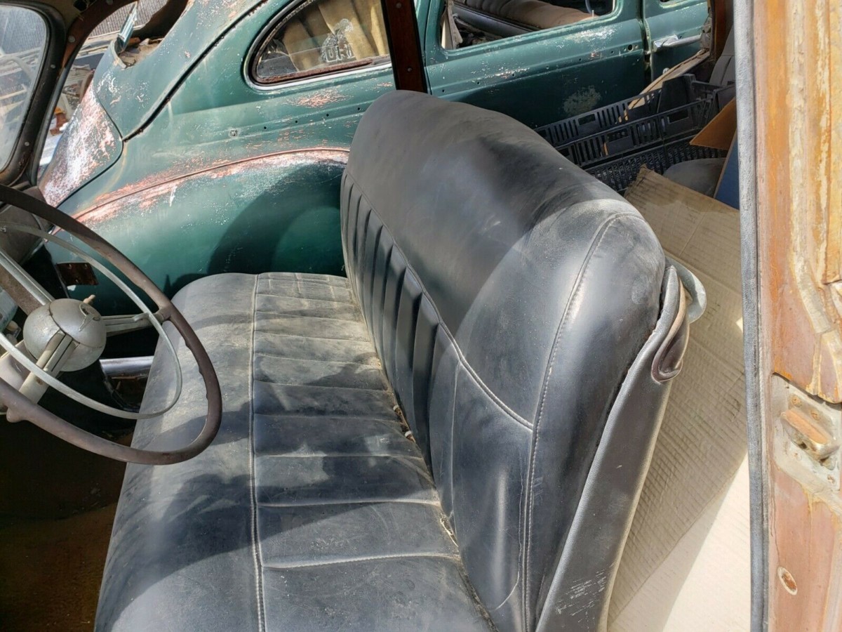The ad says at one point that it’s a ’49 Special Deluxe but you can ignore that. The good points of this car are a fairly decent interior (the seats were redone, apparently in vinyl, during the ’90s), that rebuilt mill (no word on whether it’s original to the car), and not a lot of visible rust, though it’s certain to lurk in hidden recesses. The dash looks complete albeit with surface rust. The whole front of the car is nice, with all the irreplaceable chrome in place, badges present, and no tinworm. The front and rear glass is in place.