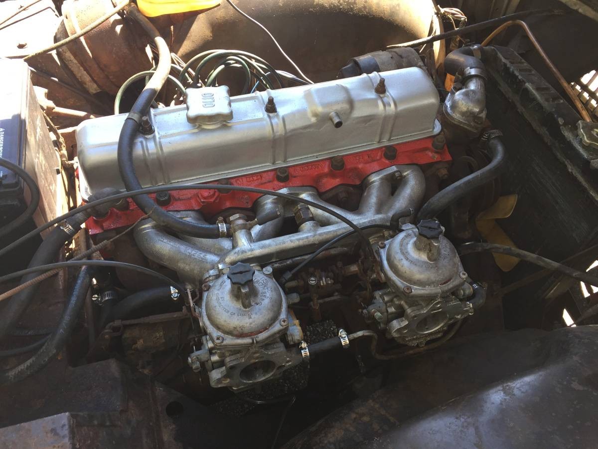 Under the hood the car has a 2.5 liter inline six cylinder engine that the seller states is in running condition. This engine in US spec was rated at 105 horsepower from the factory. The seller acquired this car along with another car in a package deal. After doing some valve work and rebuilding the Stromberg carburetors, the engine is in running order. The seller put the back wheels up in the air and shifted through the gears and said the 4 speed manual transmission is working.