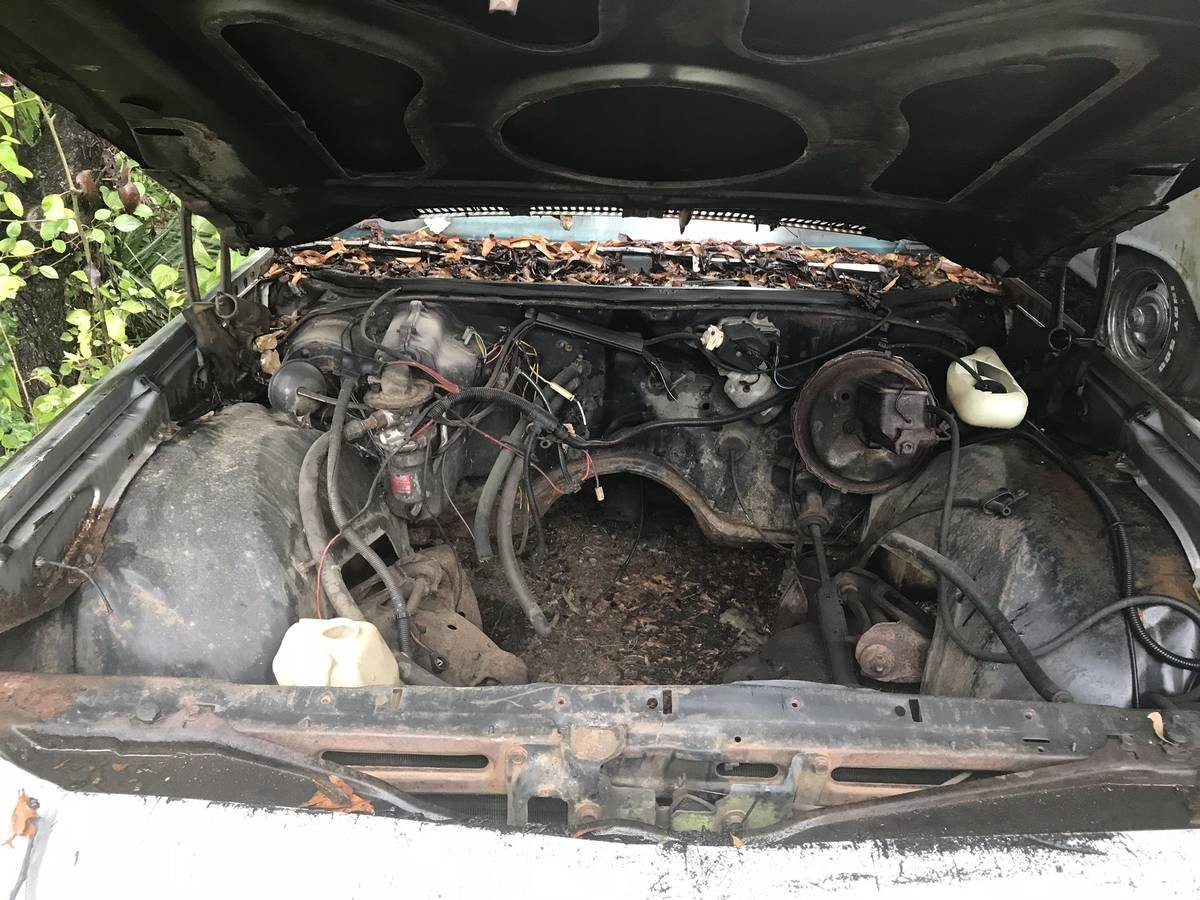 With the interior practically out of the car, the front floor pans are said to be and there is rust in the trunk pan. The roof, front fenders, and quarter panels appear to be okay in case you’re looking for those parts for another project. Apparently, some of the removed interior pieces are missing and you may have to bring your own wheels to carry the car away as the seller says the ones on this one are not included. And, BTW, this transaction will be by Bill of Sale only, although the car is registered in the seller’s name. Parts car or restoration? What do you think?