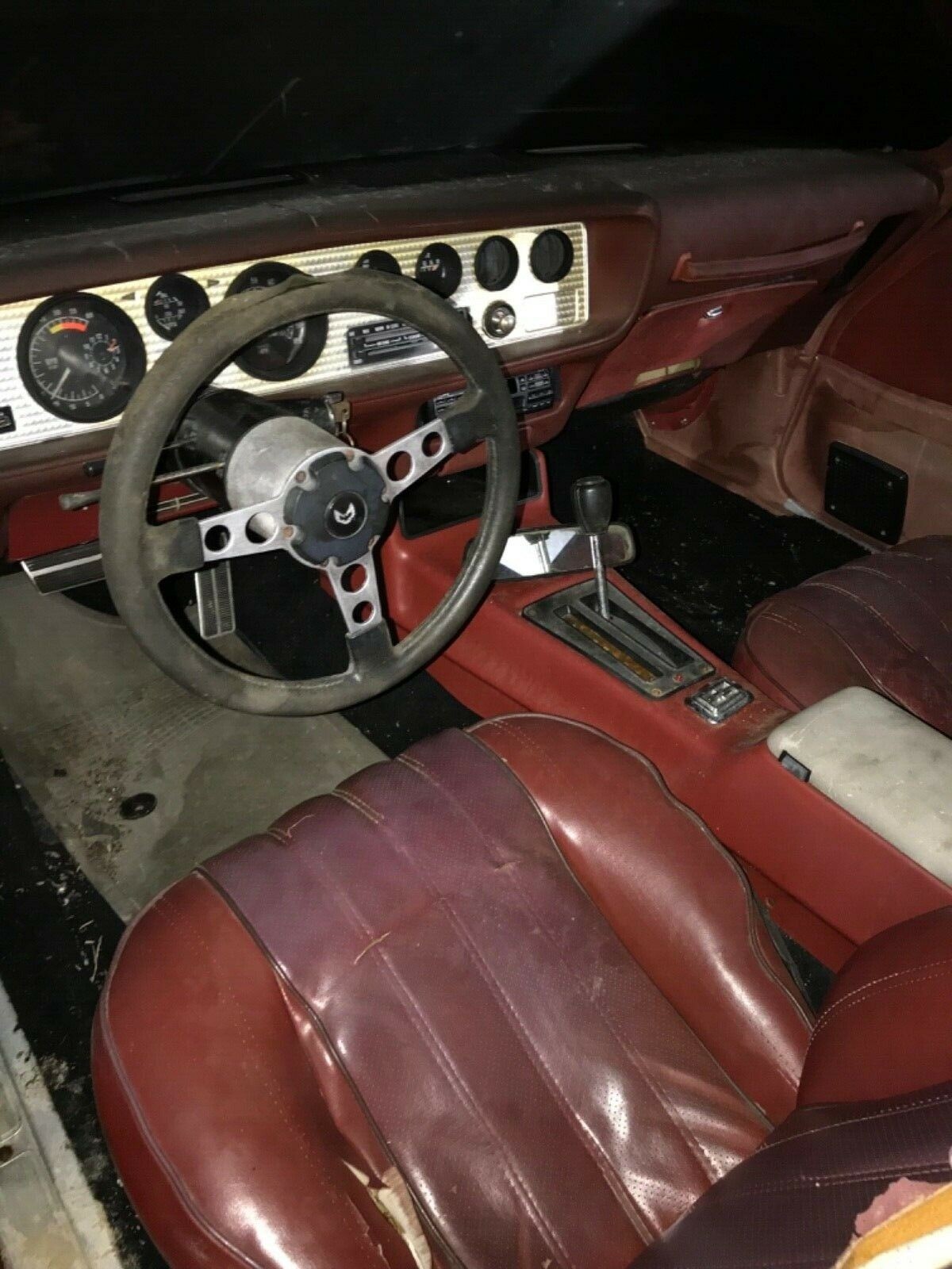 The interior of the car does not have much that can be saved and appears to have some water damage. The car does have tilt steering, deluxe interior seats and power windows. 1976 was a unique year for the Trans Am with a one year only front end and the rounded hood scoop made its last appearance and was nonfunctional from the factory. My older brother had a 1976 Trans Am when he was in high school. The car was slow by today’s standards but sitting in the passenger seat watching the scoop shake made an indelible impression on me. He later opened up the scoop and put a screen over it. I remember watching leaves and pine straw getting sucked up on the screen when he accelerated. His car was immaculate compared to this one!