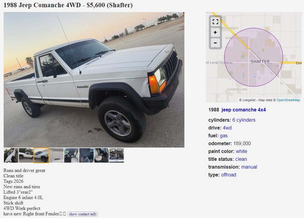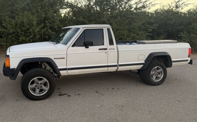 I’m not sure I’ve seen a Carolina Squat 1988 Jeep Comanche before, but the seller says this one has been lifted 3″ in the front and 2″ in the back. I guess, to each his/her own, but I’d drop this thing down within the first week if I owned it. It’s such a great truck, too nice to embarrass it by doing that. Poor thing… Enough of that, they have it posted here on craigslist in Shafter, California, and they’re asking $5,600. Here is the original listing, and thanks to Rocco B. for the tip!
