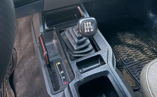 The seller has mostly Batman angles on the photos that they provided, and there weren’t any showing the rear of this Jeep at all, so I’ll just put the coolest photo here, one showing the 5-speed manual. That’s what you want in this Jeep, I think. Although my opinion is just that, my opinion, no more or less valid than anyone else’s opinion. We don’t know what the bed looks like or the tailgate; hopefully, all is well with it, other than the dent on the right fender. They mention having a replacement fender for that side, so that’s great news.