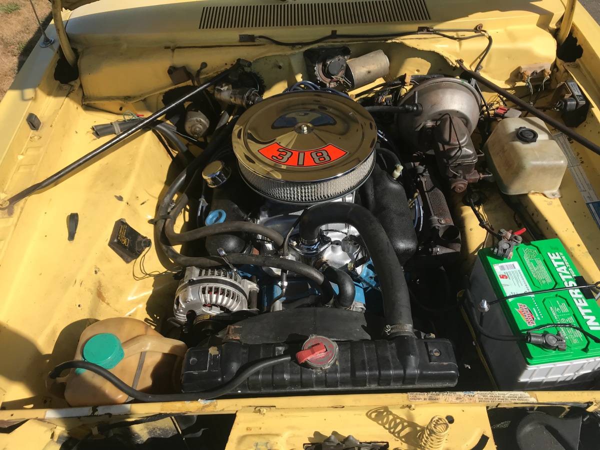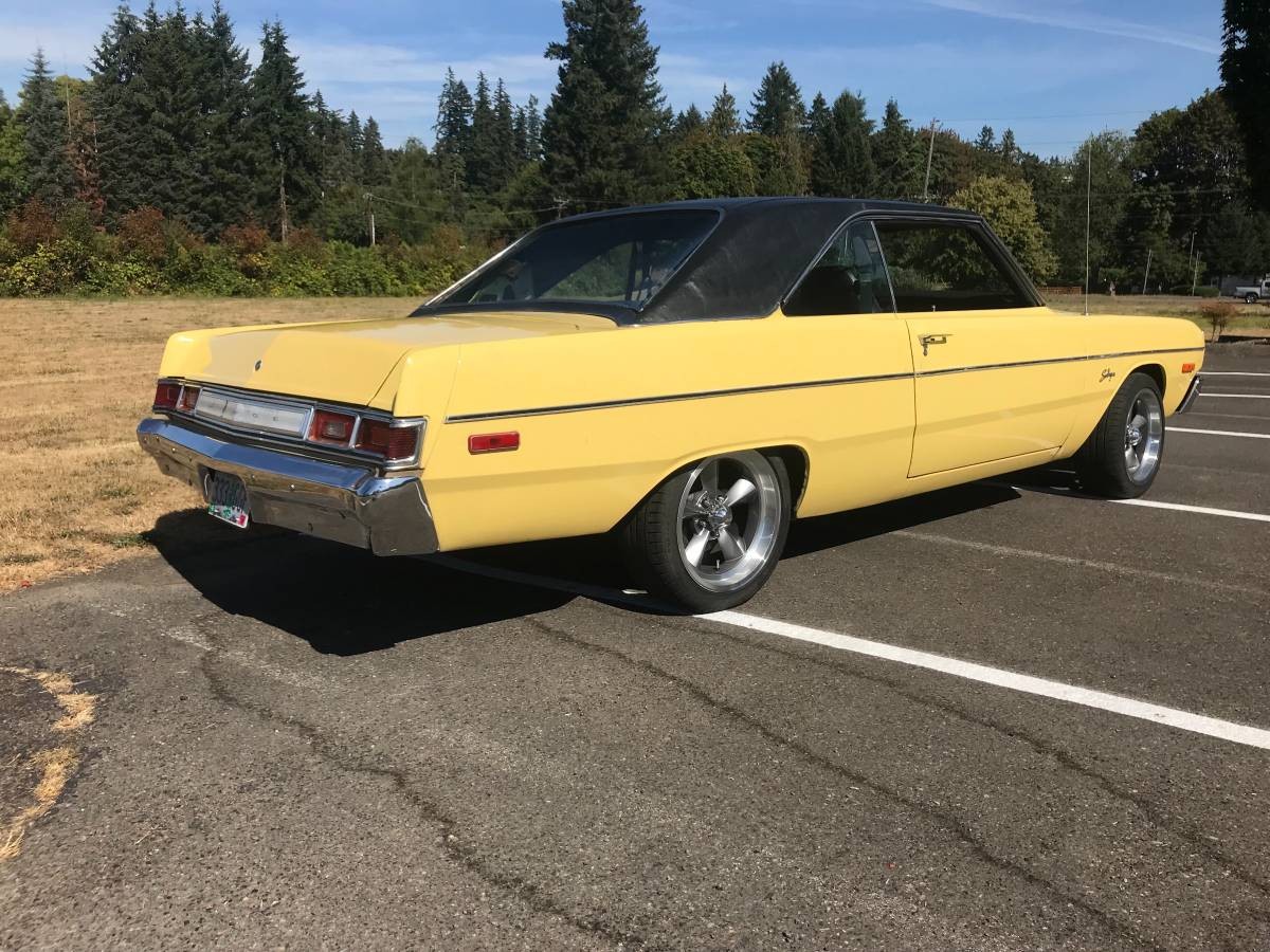 The original Yellow Blaze paint does show some scratches and dings. There appears to be no rust on the body. The black vinyl top appears to be in good condition. Aftermarket wheels are included. The rear window of this curved outward much like the full-size Chevrolet of 1971 to 1976, but Dart had it first.