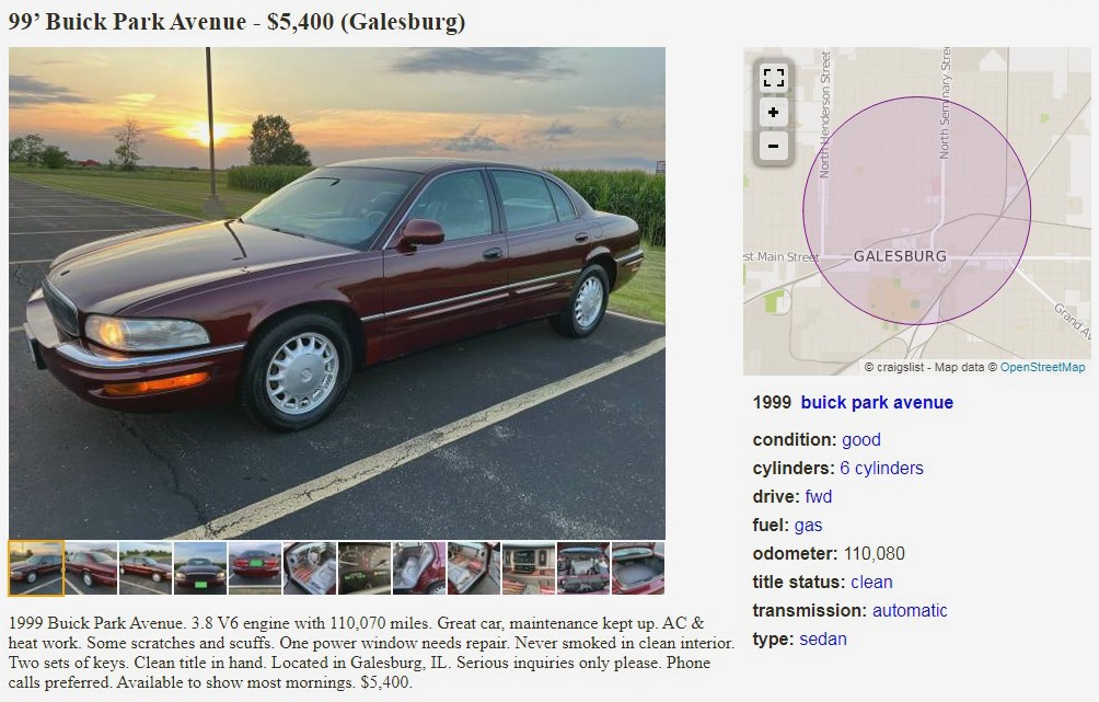 One of the finest names for a luxury car of all time, Buick’s Park Avenue conjures up images of a well-dressed couple in formal wear, walking along Park Avenue in NYC just after a rain, with wet streets reflecting how fantastic it was to be rich in the golden era of America, back when rich folks had class. I mean, not that they don’t today… Whew, that was close. In any case, this 1999 Buick Park Avenue is posted here on craigslist in Galesburg, Illinois, where the seller is asking just $5,400. Wait, $5,400? Here is the original listing, and thanks to classy Tony P. for the tip!