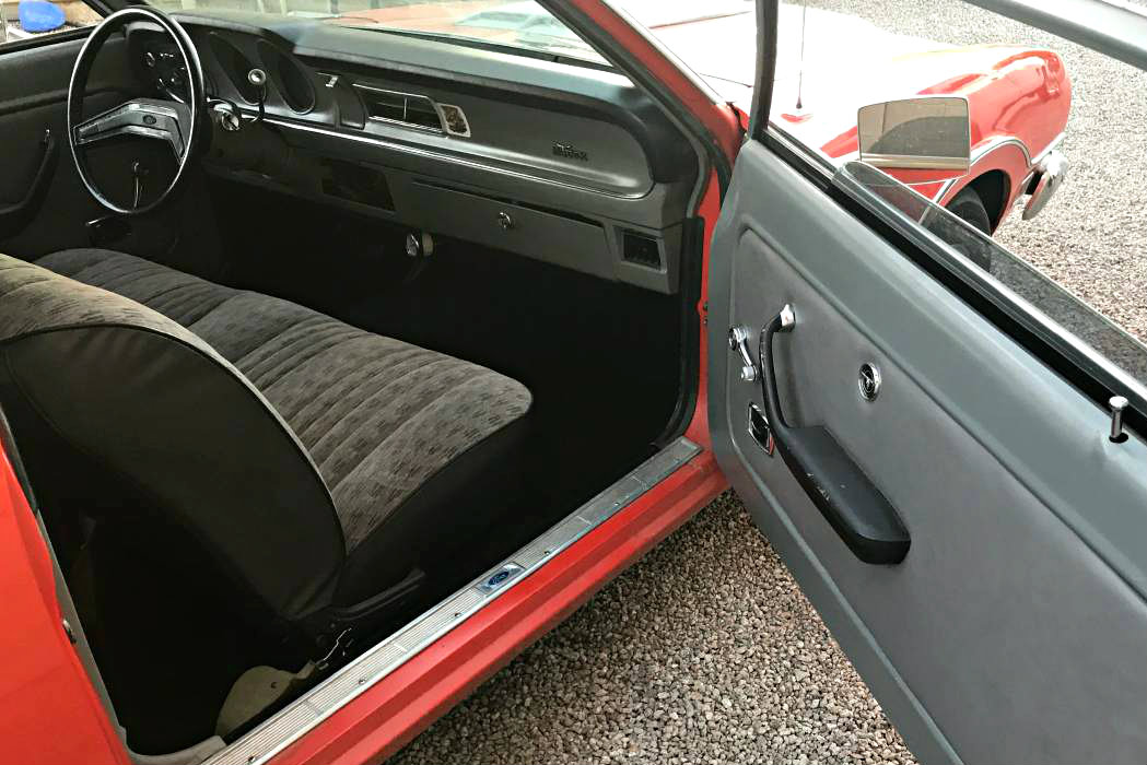 The owner did right by this nice condition car, by performing a clean and beautiful swap. The 302 V8 is mated to aC4 auto and has apparently made quite the long trek to Texas and back. An aluminum radiator, electric cooling fan, and “upgraded” alternator were all recent additions upon the long and sweltering trip to Texas. Painted nicely, the engine presents well, and looks like a pleasure to work on as it isn’t covered in oil and dirt. I guess the only gripe I have is this car is a manual steering, manual brakes vehicle. Now that the swap is complete and running smooth, I would at least opt for power assisted disk brake and possibly hooking up the air conditioning system again as this is a factory a/c car.