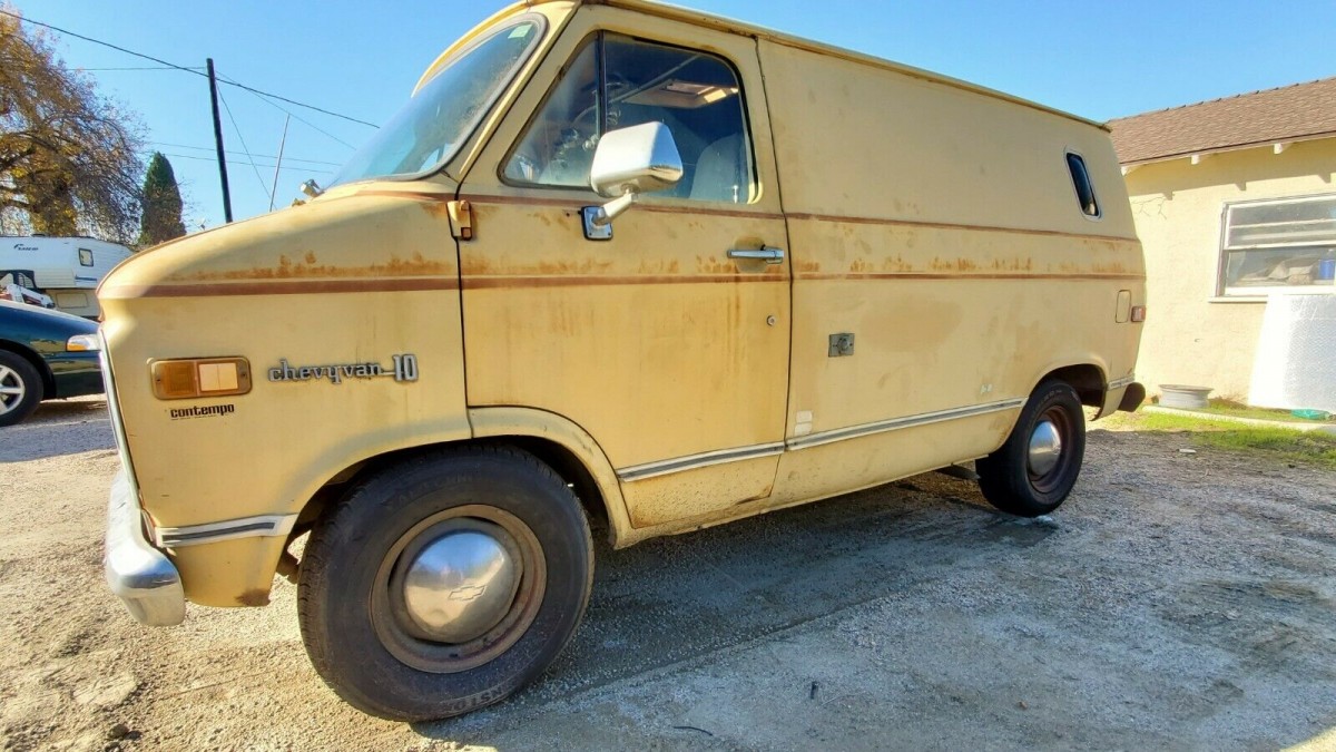 This 1974 Chevrolet G10 is a desirable short wheelbase, half-ton conversion van with the 350 V8 engine and a camp-ready interior. The van was modified by a company called Contempo in 1974, and retains badges from that vendor identifying the conversion work as their own. The van is a project but one that looks entirely worthy of bringing back, especially with an interior that has survived surprisingly well despite its time off the road. Find it here on eBay where the auction ends tonight and bidding is at $5,100 with no reserve.