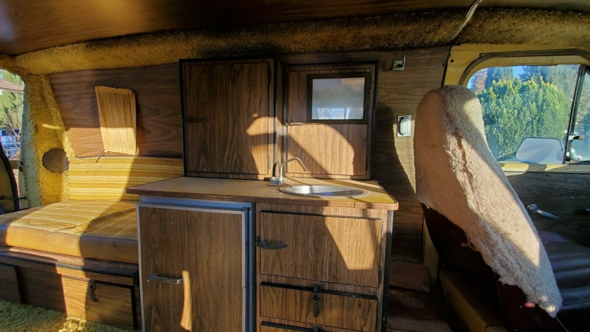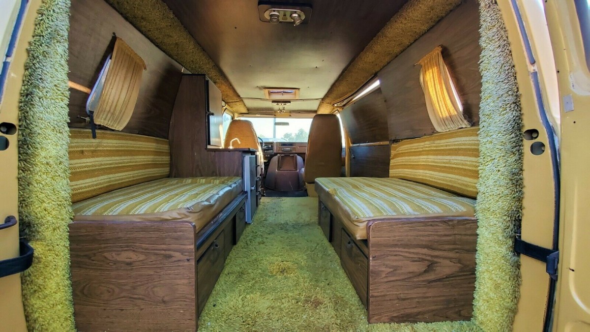 Like almost every conversion van from the 1970s, shag carpeting runs rampant on the insides. That’s OK, especially when it’s as clean as this one. I’m very impressed by how clean this cabin remains despite the exterior looking fairly tired and the van not seeing much use in the past few years. Curtains remain hung on the window and not in tatters, and the fake wood paneling looks fairly clean and professionally installed. Even if you don’t love shag carpeting, I could live with this for a few years as it still looks downright presentable.