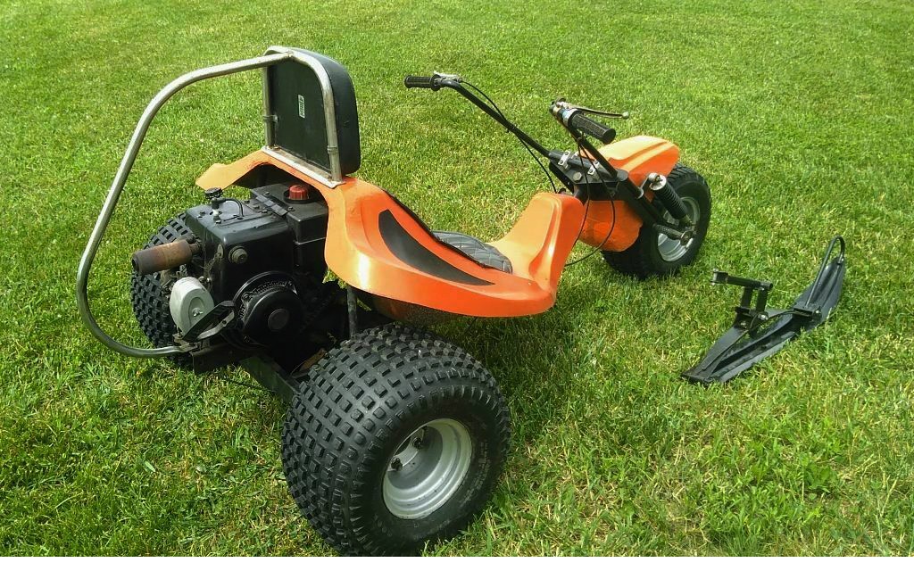 Being an avid dirt biker in the ’70’s, I had heard of these, but never saw one. A friend and I built a go-kart with a single cylinder JLO, same tires, only 4, and skis for winter. It worked on only the hard packed snow, the rear tires actually held it back.These were pre-ATV’s, trying to cash in on the awful Honda 3 wheeler craze, and were probably just as dangerous.