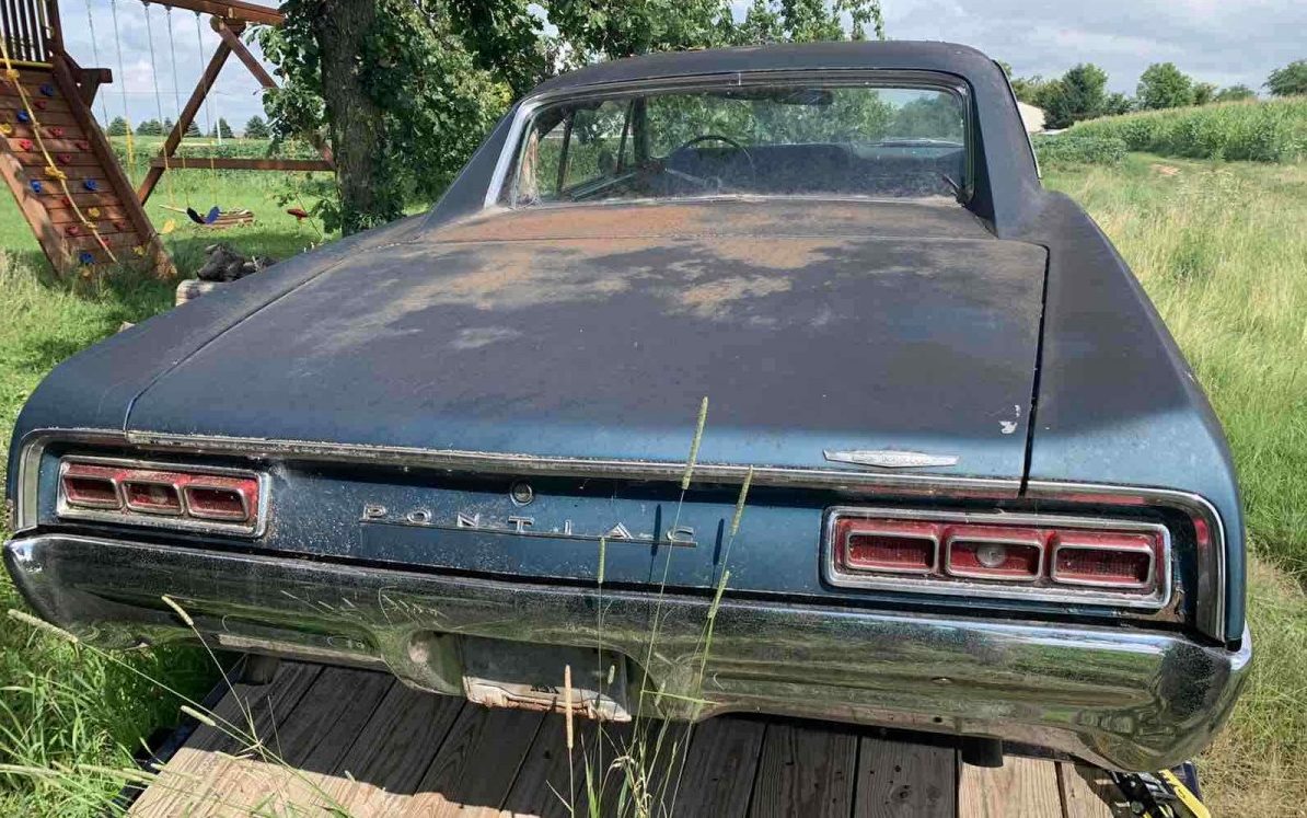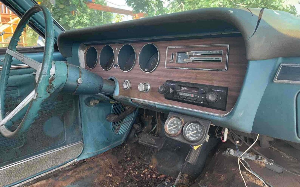 Obviously parked outside for some period of time, this LeMans has a world-weary (or maybe an out-in-the field-weary) look about it. It’s worn Tahoe Turquoise Metallic (code L) finish is completely flat, with some surface rust bleed-through, but is in better shape than one would expect for 53 years – a good deal of that time having been spent outdoors. The body is straight and not showing immediate signs of rot-through, unusual for this vintage of “A” body – as the seller states, “pretty good shape for a ’67”. While the frame is supposedly sound, the floors and trunk pan need help, they are both rusted through in places. The trim appears to be all there and the Pontiac Rally II wheels are a nice addition.