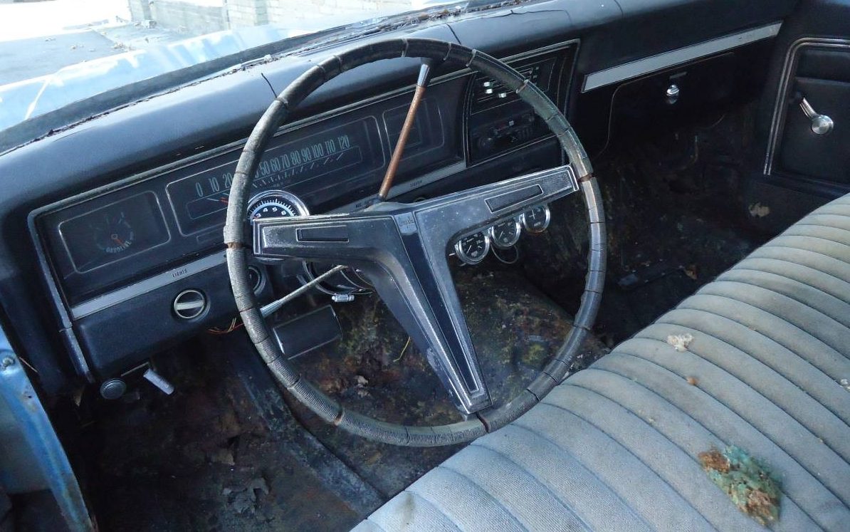 This Impala is listed as an 89K mile example and it’s a little rough around the edges. There is some identifiable rust, notably around the rear window but there are no revealing images of the fender legs and lower quarters where rust starts on this vintage Impala. The seller does claim that the frame and floors are solid, however. The expensive and non-reproduced headlight buckets are missing, as is a lot of the trim. It’s hard to say what specifically is going on with the left quarter but it appears that a thick slab of Bondo is separating. The wheels are the commonly found Chevrolet rally wheels but in a width considerably wider than what was available as an option on this Impala.