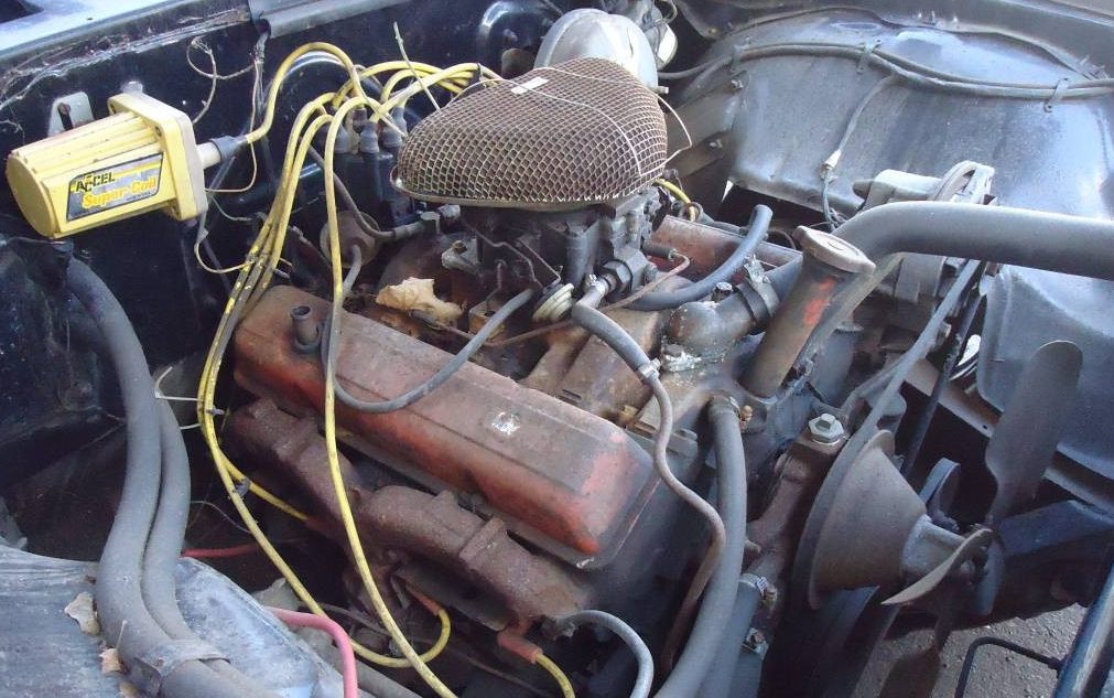 The interior of this Chevy has seen better days. The steering wheel is about to disintegrate into 20+ pieces, the dash pad is cracked, the carpet has been removed, the front seat looks to have been recovered with a pullover cover and the kick panels are MIA. Auxillary gauges and an aftermarket tachometer have been added but the fuel gauge has lost, at the least, its ground as it’s pointed down at six o’clock. Everything here is repairable and most of the needed replacement parts are available from a variety of sources.