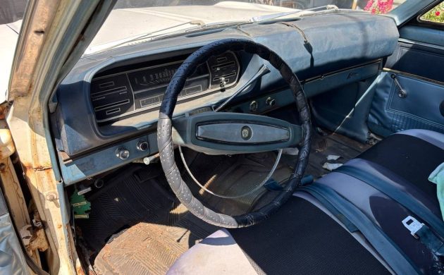 The rear view mirror is new as are the wiper arms, but those are the only concessions to the driver’s confidence and comfort. Nearly every square inch of the interior needs attention – including the floors, which the seller admits are rusty. I don’t like the look of the A-pillar or the door jamb either. Fortunately, plenty of vendors will sell you interior components, and these guys will restore that dash. The third generation Falcon lost the metal instrument panel and round gauges of earlier Falcons; I find this arrangement less appealing.