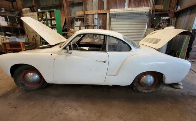 This vehicle was parked in the barn 15 years ago due to a knock in the air-cooled engine. The body doesn’t look bad and wears a coat of primer. One wheel is locked up, so you’ll need to bring a roller to get it moved. No title or keys with this one. Current bid: $2500.