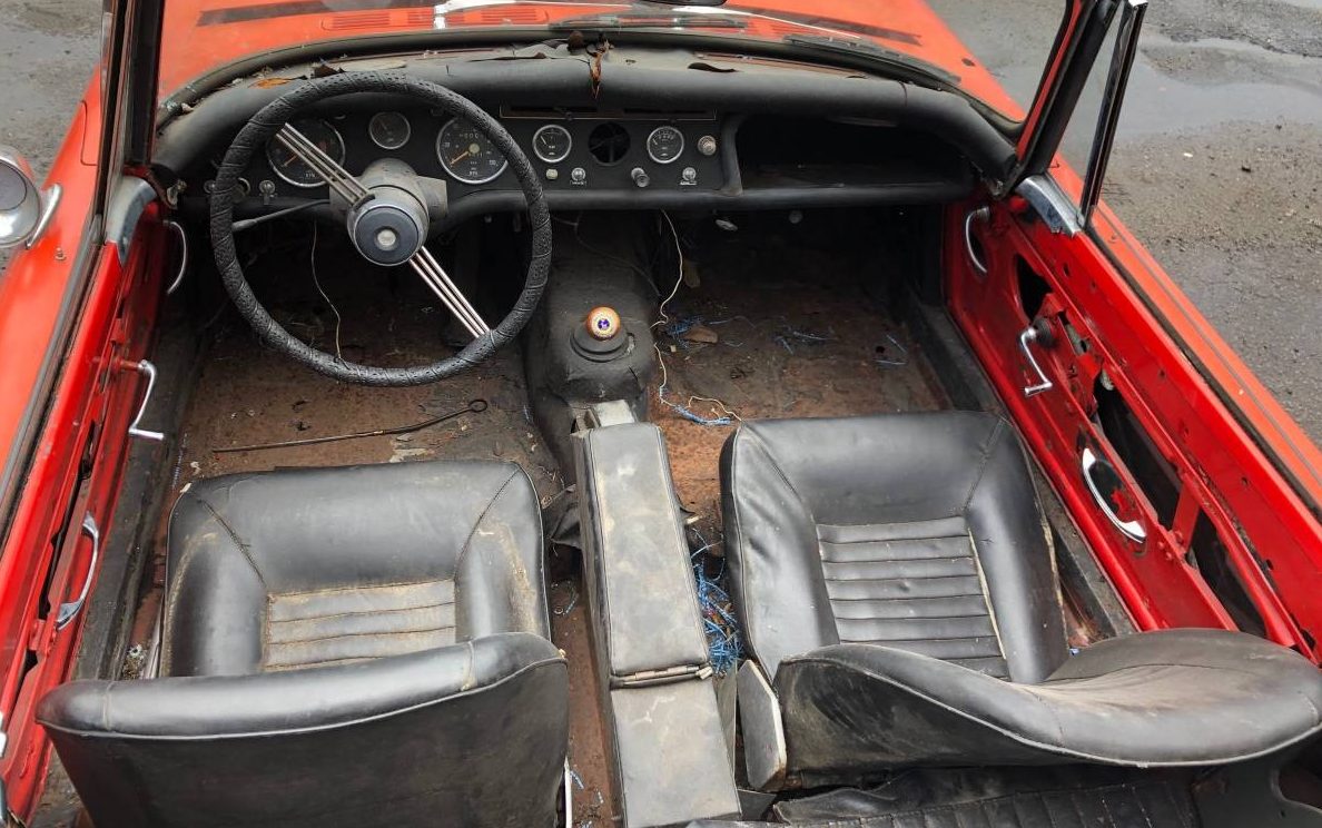 This Alpine is a bit rough around the edges, the orange/red finish is badly faded but the body seems to be reasonably intact. I would be concerned about rust, always an issue with a New Jersey car, though none is evident via the images. The floors show surface rust but it is not clear if it is corrosion beyond the surface state. The chrome is weak and the bumpers, both front and back, appear to have minor dents. It does seem that all of the trim is present, however. The trunk lid may just be ajar but it looks misaligned. It’s hard to say if there is a useable convertible top, there is something rumpled sitting in the space that the folded top normally occupies. Of note are the “tea-strainer” headlight grilles.