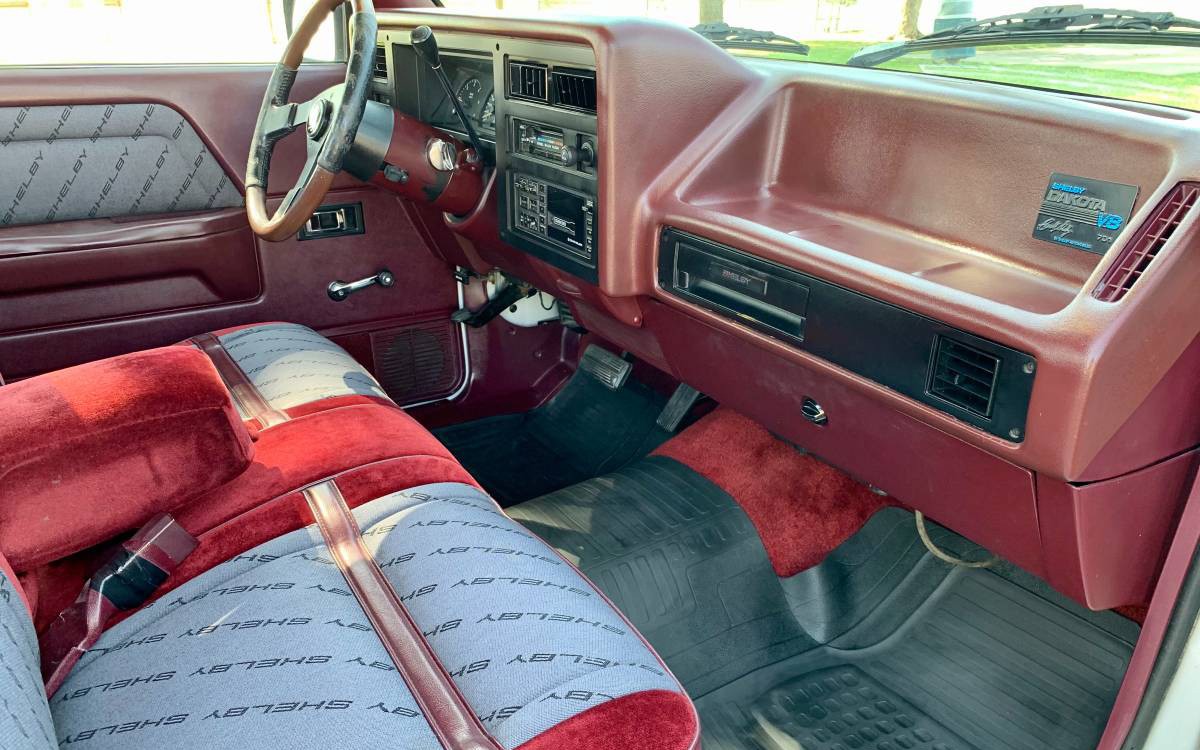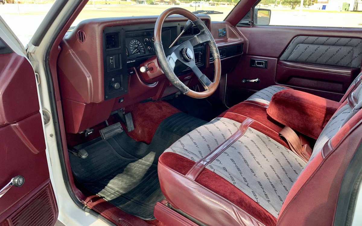 The interiors were dressed up with Shelby Shelby Shelby logo seats and door panel inserts and they were all two-wheel-drive trucks with four-speed automatic transmissions and column-mounted shifters. The seller says that this one has cold air-conditioning which is a plus on a 32-year-old vehicle.