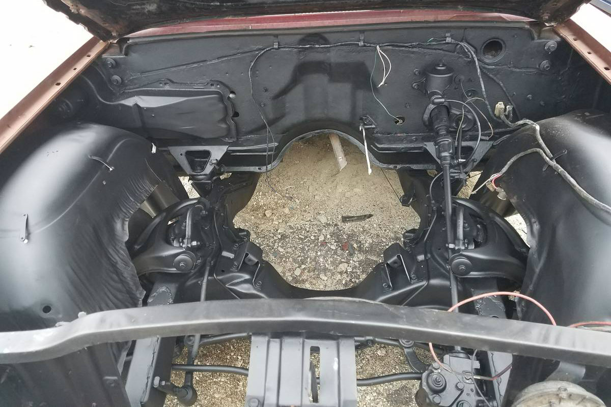 Am I the only one who wonders whether this was in a serious front collision? The front of the frame looks like it’s been welded in, and quite unevenly- tacked in on the left side and heavily overdone (unless it’s seam sealer) on the right. The faded front clip leans toward that in my eyes, too. And though I don’t know a lot about these cars, the firewall has some very odd- looking lines on it too. Anybody here who has knowledge to go with their “back- in-the-day” stories?