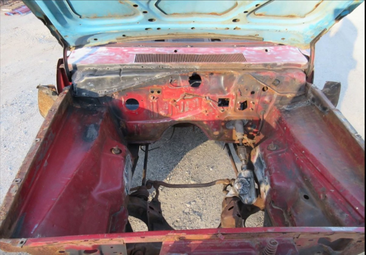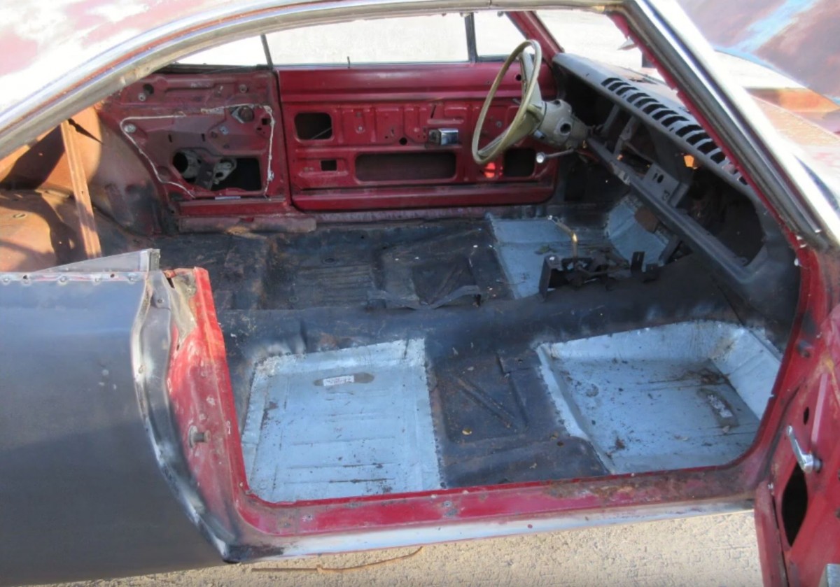 This photo gives us a decent view of the floors, so you can see the work required to get them back into shape. What you can also see is almost all of the interior parts that are included in the sales. There are seat frames, but there are no other trim pieces. That means that the buyer will be starting from scratch, but that will also mean that they can choose how they will trim the interior. They might decide on a faithful restoration, or a custom interior could be the go. Either way, they will be spending some money.