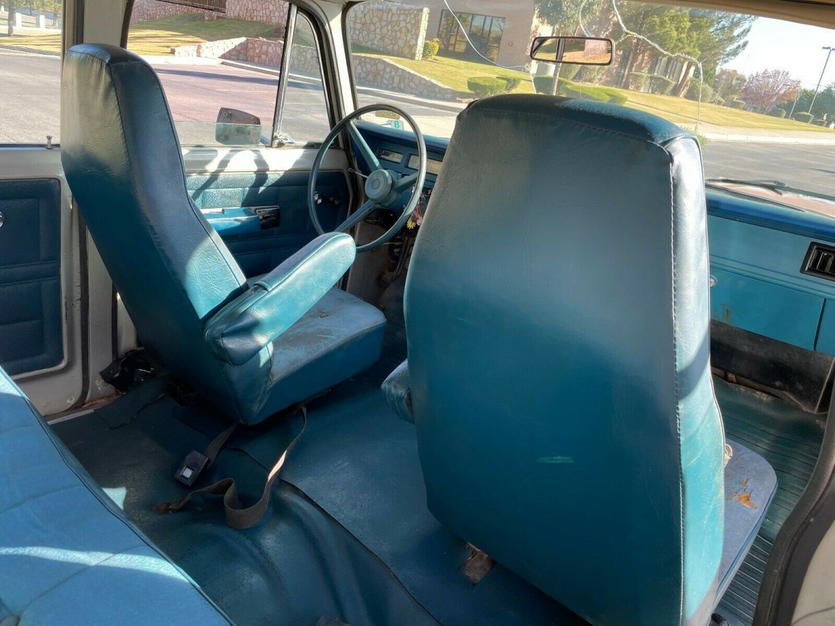 The blue interior is part vinyl and part cloth. The dash is cracked and the seats show wear and are starting to come apart and revealing the foam underneath. Not much is said about options but the engine compartment indicates that it has air conditioning. The Travelall has been sitting in storage for a while and the seller has replaced the fuel filter and worked on the brakes and cleaned the fuel tank. The engine looks like it has received a new battery and upper radiator hose.